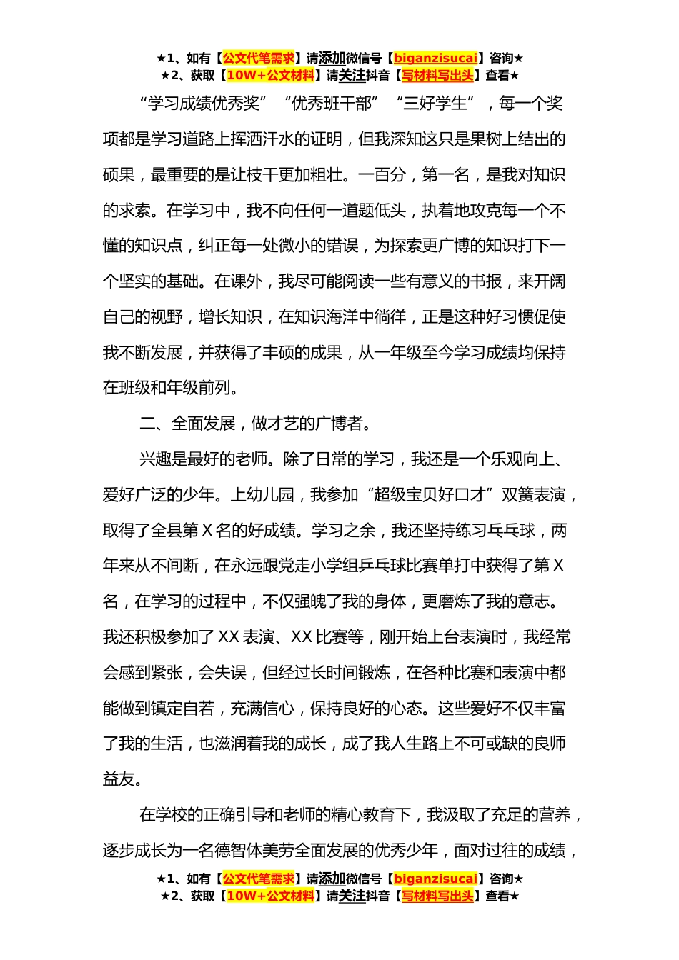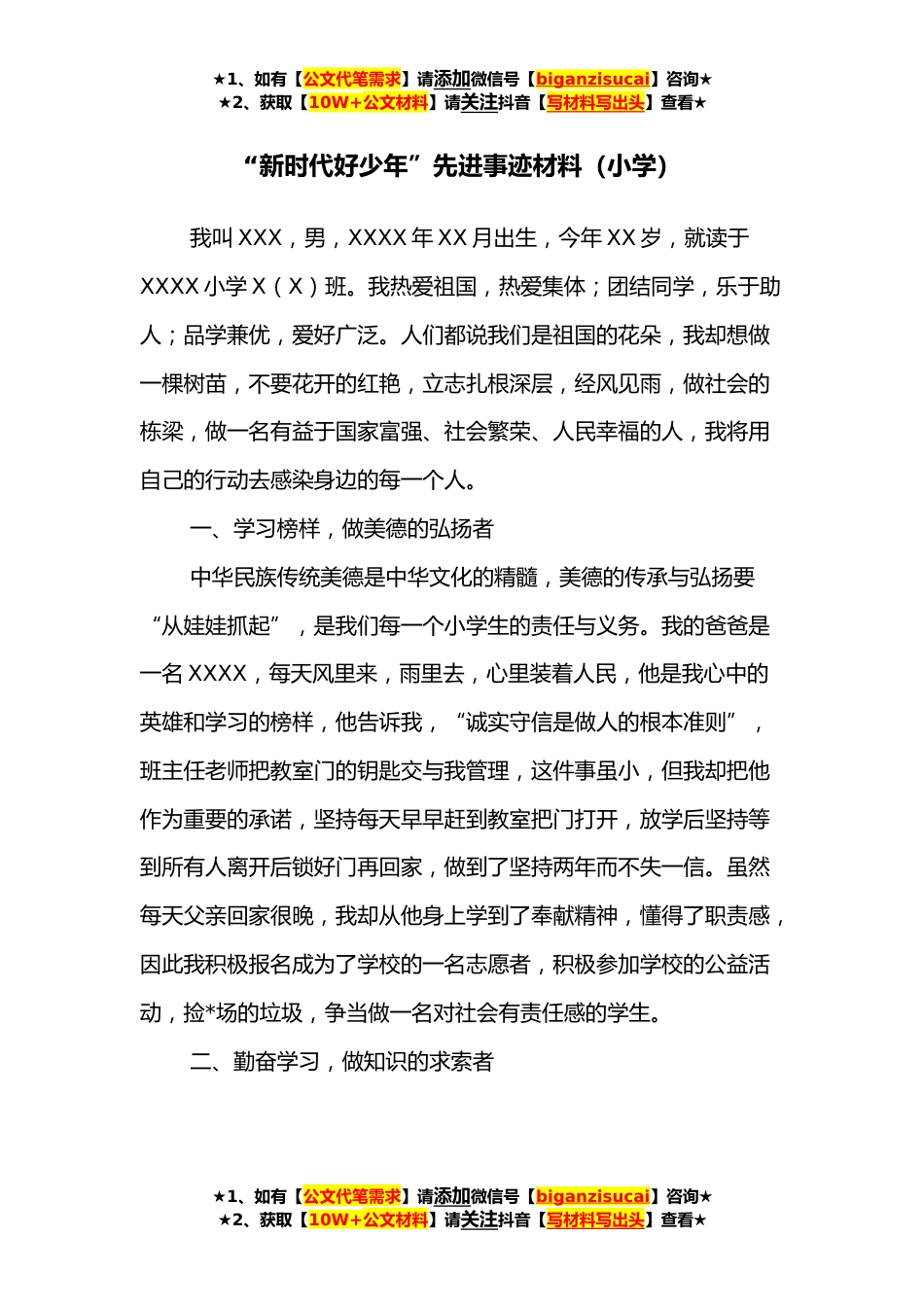 ★1、如有【公文代笔需求】请添加微信号【biganzisucai】咨询★★2、获取【10W+公文材料】请关注抖音【写材料写出头】查看★“新时代好少年”先进事迹材料(小学)我叫XXX,男,XXXX年XX月出生,今年XX岁,就读于XXXX小学X(X)班。我热爱祖国,热爱集体;团结同学,乐于助人;品学兼优,爱好广泛。人们都说我们是祖国的花朵,我却想做一棵树苗,不要花开的红艳,立志扎根深层,经风见雨,做社会的栋梁,做一名有益于国家富强、社会繁荣、人民幸福的人,我将用自己的行动去感染身边的每一个人。一、学习榜样,做美德的弘扬者中华民族传统美德是中华文化的精髓,美德的传承与弘扬要“从娃娃抓起”,是我们每一个小学生的责任与义务。我的爸爸是一名XXXX,每天风里来,雨里去,心里装着人民,他是我心中的英雄和学习...