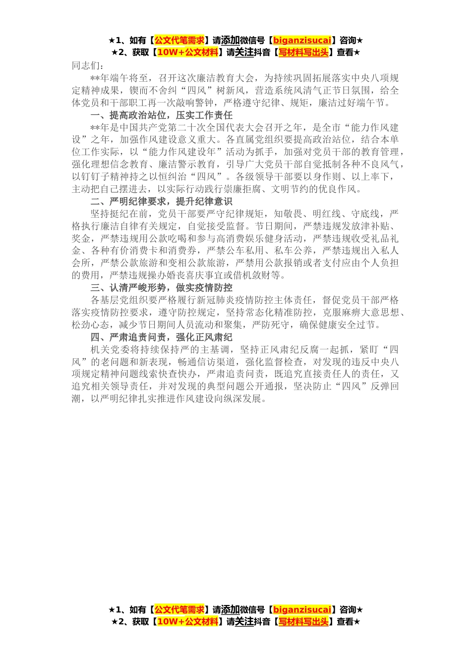 ★1、如有【公文代笔需求】请添加微信号【biganzisucai】咨询★★2、获取【10W+公文材料】请关注抖音【写材料写出头】查看★同志们:**年端午将至,召开这次廉洁教育大会,为持续巩固拓展落实中央八项规定精神成果,锲而不舍纠“四风”树新风,营造系统风清气正节日氛围,给全体党员和干部职工再一次敲响警钟,严格遵守纪律、规矩,廉洁过好端午节。一、提高政治站位,压实工作责任**年是中国共产党第二十次全国代表大会召开之年,是全市“能力作风建设”之年,加强作风建设意义重大。各直属党组织要提高政治站位,结合本单位工作实际,以“能力作风建设年”活动为抓手,加强对党员干部的教育管理,强化理想信念教育、廉洁警示教育,引导广大党员干部自觉抵制各种不良风气,以钉钉子精神持之以恒纠治“四风”。各...