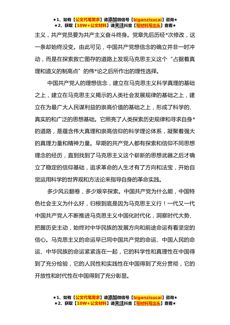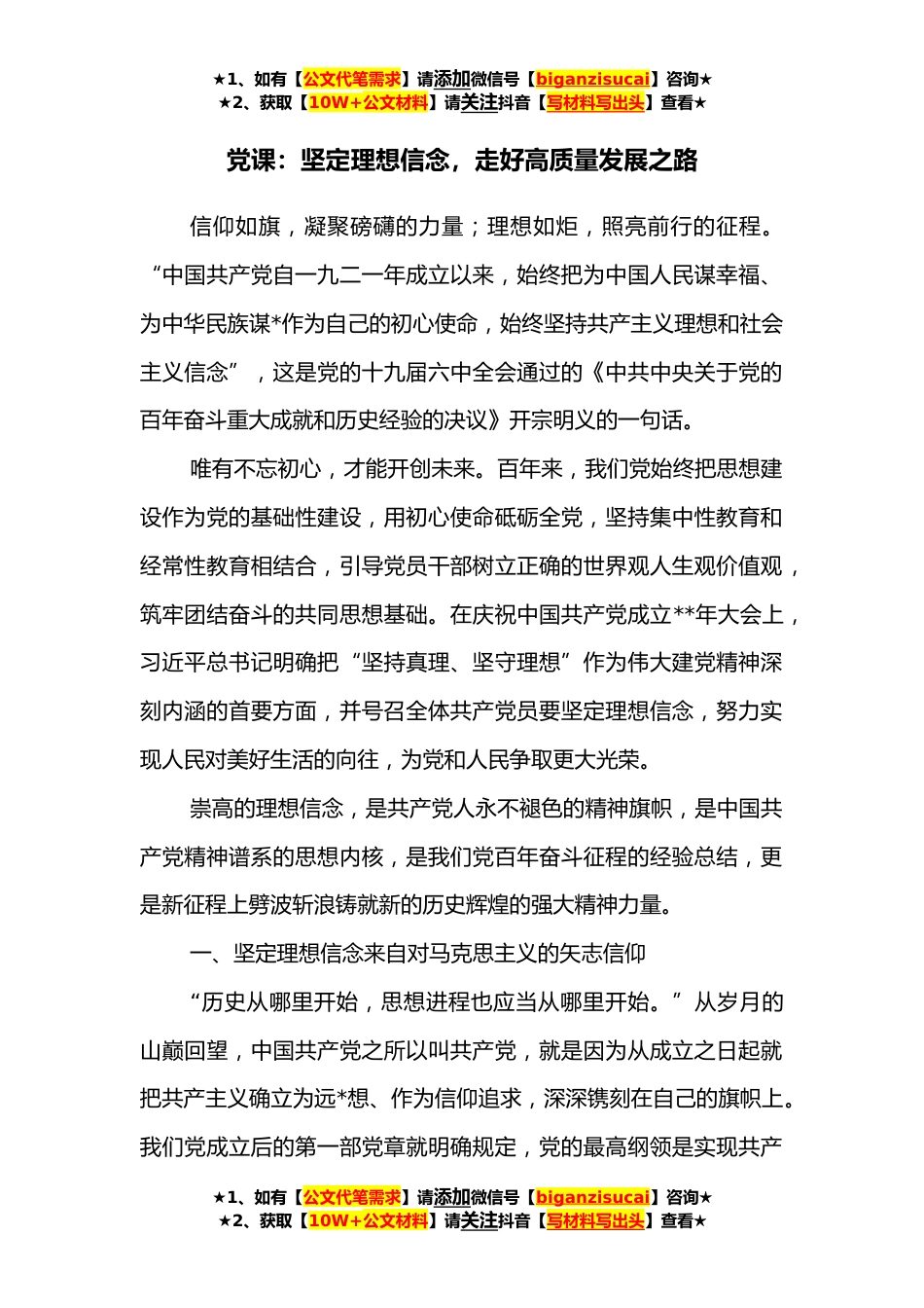 ★1、如有【公文代笔需求】请添加微信号【biganzisucai】咨询★★2、获取【10W+公文材料】请关注抖音【写材料写出头】查看★党课:坚定理想信念,走好高质量发展之路信仰如旗,凝聚磅礴的力量;理想如炬,照亮前行的征程。“中国共产党自一九二一年成立以来,始终把为中国人民谋幸福、为中华民族谋*作为自己的初心使命,始终坚持共产主义理想和社会主义信念”,这是党的十九届六中全会通过的《中共中央关于党的百年奋斗重大成就和历史经验的决议》开宗明义的一句话。唯有不忘初心,才能开创未来。百年来,我们党始终把思想建设作为党的基础性建设,用初心使命砥砺全党,坚持集中性教育和经常性教育相结合,引导党员干部树立正确的世界观人生观价值观,筑牢团结奋斗的共同思想基础。在庆祝中国共产党成立**年大会上...