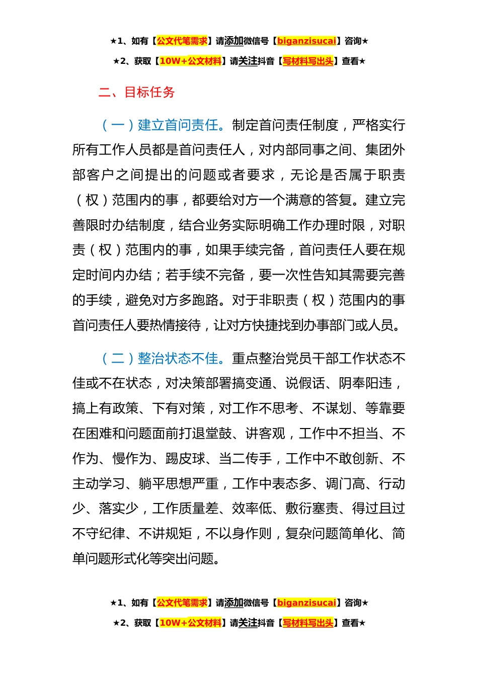 ★1、如有【公文代笔需求】请添加微信号【biganzisucai】咨询★★2、获取【10W+公文材料】请关注抖音【写材料写出头】查看★公司党委加强作风效能建设对标行动工作方案根据市委、市国资委党委部署安排,为进一步加强作风建设,巩固提升集团作风建设成果,建设一支能打硬仗敢打硬仗、擅打胜仗的干部职工队伍,坚决整治影响和制约集团发展的痼疾顽疾以及“推、拖、绕、躲”的责任问题和“庸、懒、散、浮”的作风问题,以作风建设新成效推动工作效能大提升,为集团营造风清气正的发展环境。结合集团实际,制订本方案。一、指导思想以习近平新时代中国特色社会主义思想为指导,深入学习贯彻党的十九大和十九届历次全会精神,认真落实市委、市国资委党委加强作风建设工作部署,牢固树立“今天再晚也是早,明天再早也是...