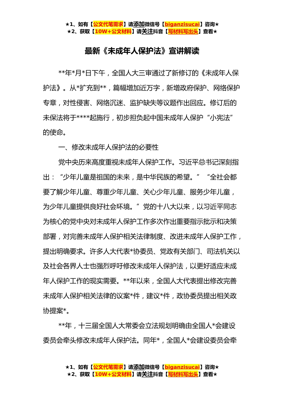 ★1、如有【公文代笔需求】请添加微信号【biganzisucai】咨询★★2、获取【10W+公文材料】请关注抖音【写材料写出头】查看★最新《未成年人保护法》宣讲解读**年*月*日下午,全国人大三审通过了新修订的《未成年人保护法》。从*扩充到**,篇幅增加近万字,新增政府保护、网络保护专章,对性侵害、网络沉迷、监护缺失等议题作出回应。修订后的未保法将于****起施行,初步担负起中国未成年人保护“小宪法”的使命。一、修改未成年人保护法的必要性党中央历来高度重视未成年人保护工作。习近平总书记深刻指出:“少年儿童是祖国的未来,是中华民族的希望。”“全社会都要了解少年儿童、尊重少年儿童、关心少年儿童、服务少年儿童,为少年儿童提供良好社会环境。”党的十八大以来,以习近平同志为核心的党中央对未成年...