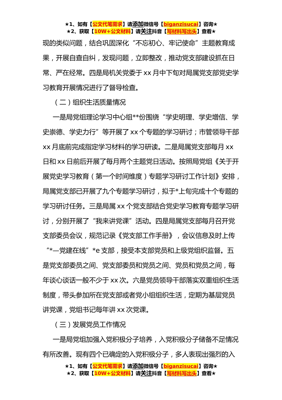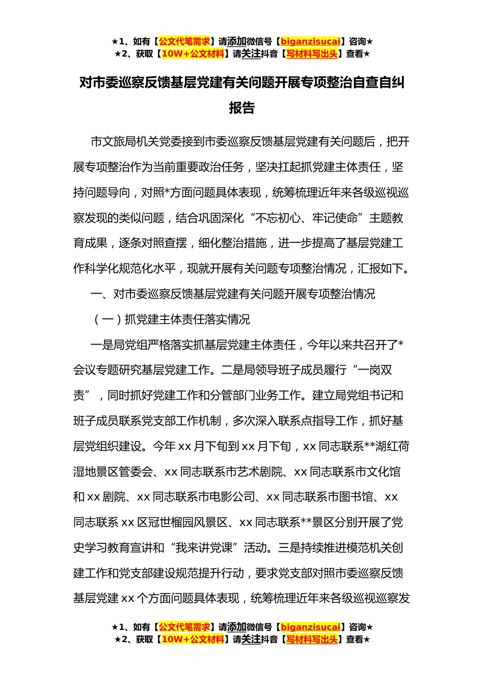 ★1、如有【公文代笔需求】请添加微信号【biganzisucai】咨询★★2、获取【10W+公文材料】请关注抖音【写材料写出头】查看★对市委巡察反馈基层党建有关问题开展专项整治自查自纠报告市文旅局机关党委接到市委巡察反馈基层党建有关问题后,把开展专项整治作为当前重要政治任务,坚决扛起抓党建主体责任,坚持问题导向,对照*方面问题具体表现,统筹梳理近年来各级巡视巡察发现的类似问题,结合巩固深化“不忘初心、牢记使命”主题教育成果,逐条对照查摆,细化整治措施,进一步提高了基层党建工作科学化规范化水平,现就开展有关问题专项整治情况,汇报如下。一、对市委巡察反馈基层党建有关问题开展专项整治情况(一)抓党建主体责任落实情况一是局党组严格落实抓基层党建主体责任,今年以来共召开了*会议专题研...
