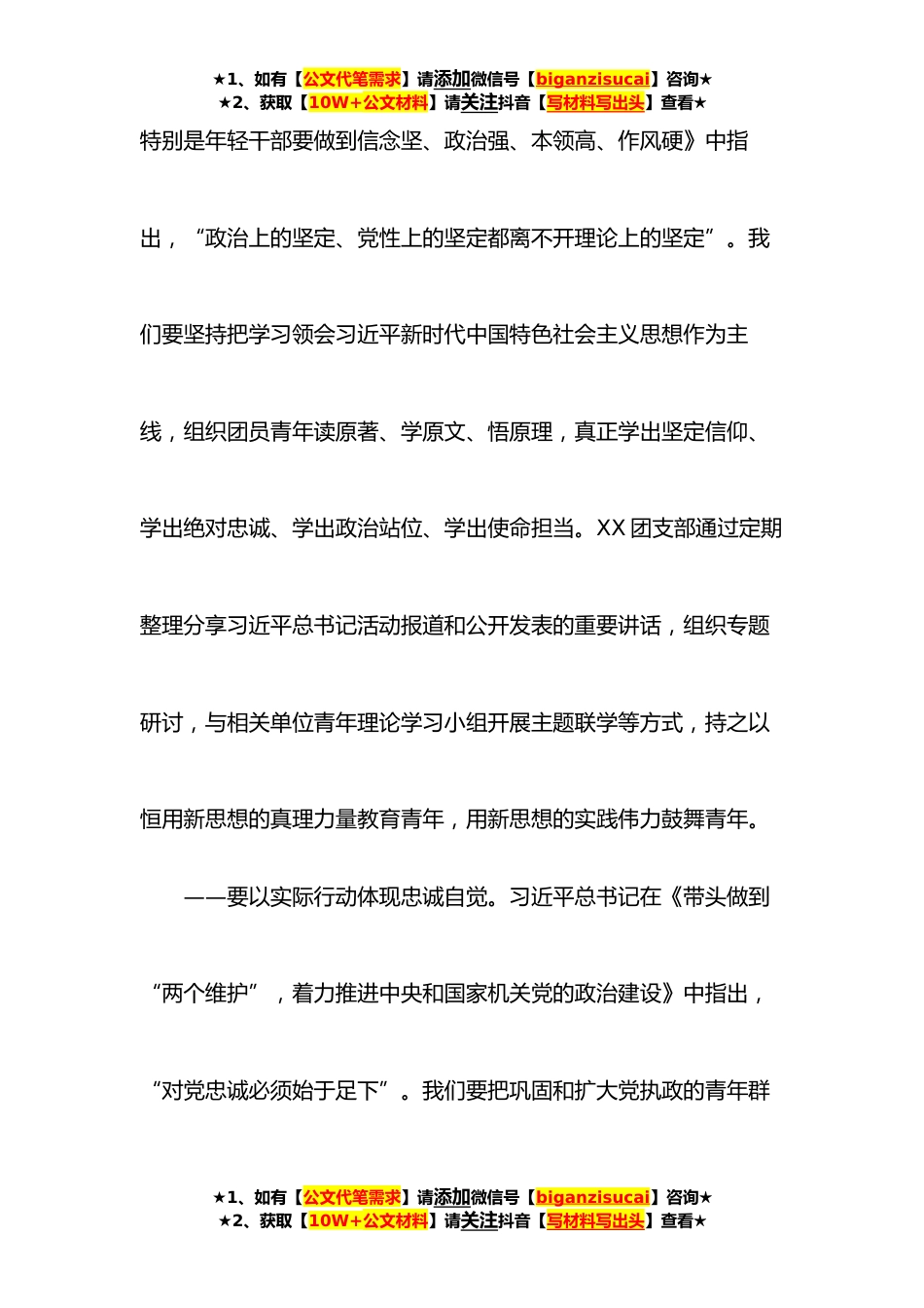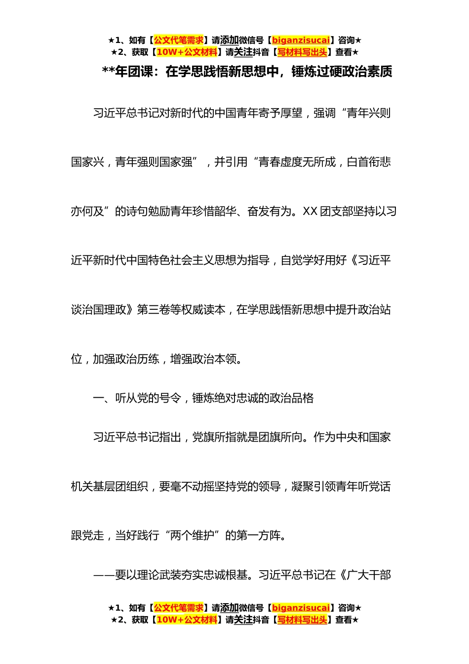 ★1、如有【公文代笔需求】请添加微信号【biganzisucai】咨询★★2、获取【10W+公文材料】请关注抖音【写材料写出头】查看★**年团课:在学思践悟新思想中,锤炼过硬政治素质习近平总书记对新时代的中国青年寄予厚望,强调“青年兴则国家兴,青年强则国家强”,并引用“青春虚度无所成,白首衔悲亦何及”的诗句勉励青年珍惜韶华、奋发有为。XX团支部坚持以习近平新时代中国特色社会主义思想为指导,自觉学好用好《习近平谈治国理政》第三卷等权威读本,在学思践悟新思想中提升政治站位,加强政治历练,增强政治本领。一、听从党的号令,锤炼绝对忠诚的政治品格习近平总书记指出,党旗所指就是团旗所向。作为中央和国家机关基层团组织,要毫不动摇坚持党的领导,凝聚引领青年听党话跟党走,当好践行“两个维护”的...