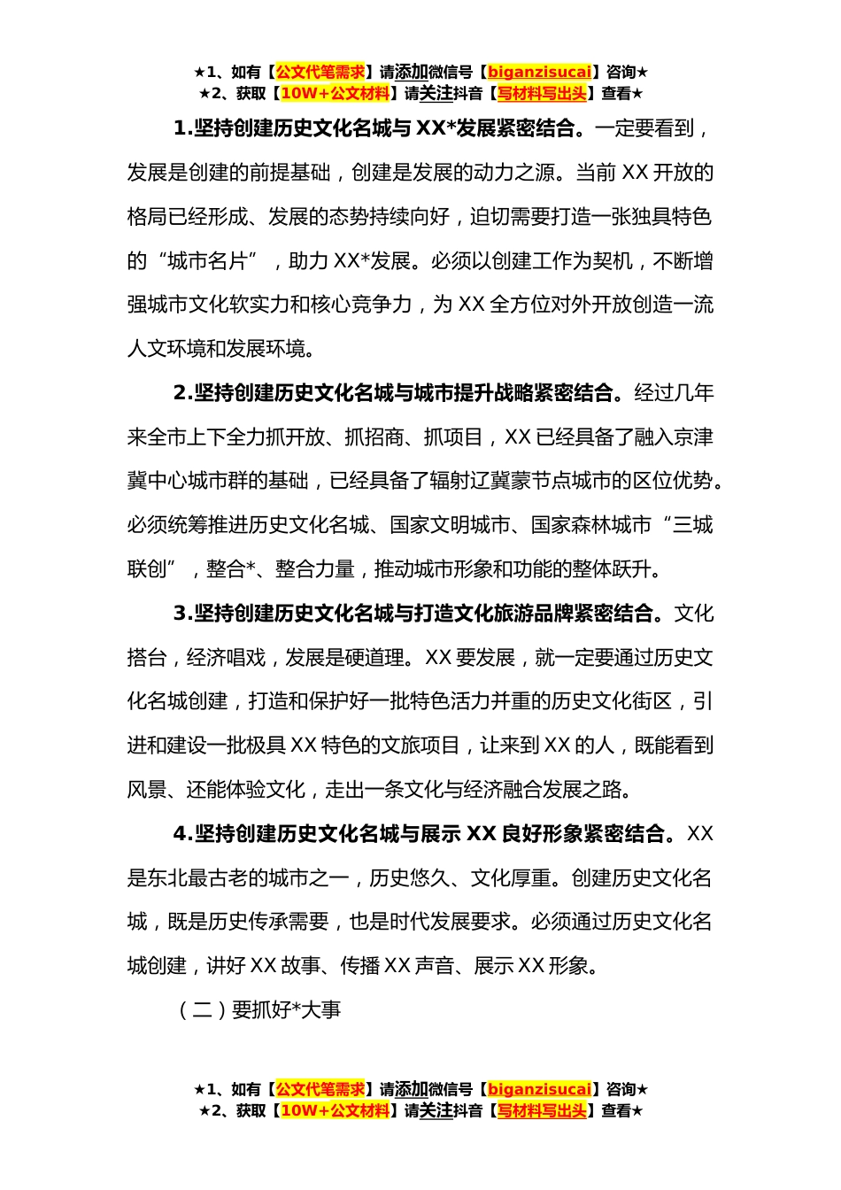 ★1、如有【公文代笔需求】请添加微信号【biganzisucai】咨询★★2、获取【10W+公文材料】请关注抖音【写材料写出头】查看★在创建国家历史文化名城、建立林长制暨创建国家森林城市工作会议上的讲话同志们:今天这次大会,既是一次动员大会,也是一次誓师大会,标志着创建国家历史文化名城、建立林长制暨创建国家森林城市工作正式拉开大幕,进入全面实施阶段。一会,XX书记还要作重要讲话,提出明确要求,请大家认真抓好贯彻落实。下面,我重点讲两方面意见。一、关于创建国家历史文化名城历史是一座城市的根,文化是一座城市的魂。XX有**多年建城史,文物遗存十分丰富,历史文化积淀深厚,已发现文物遗迹XXXX处,占全省不可移动文物总数的X/X,其中全国重点文物保护单位XX处,省级XX处,市级XX处。市委、市政府...