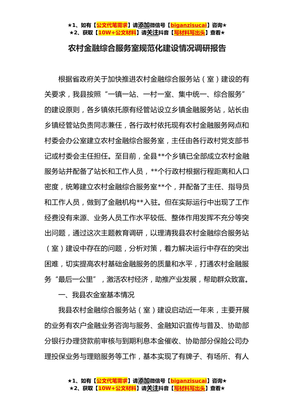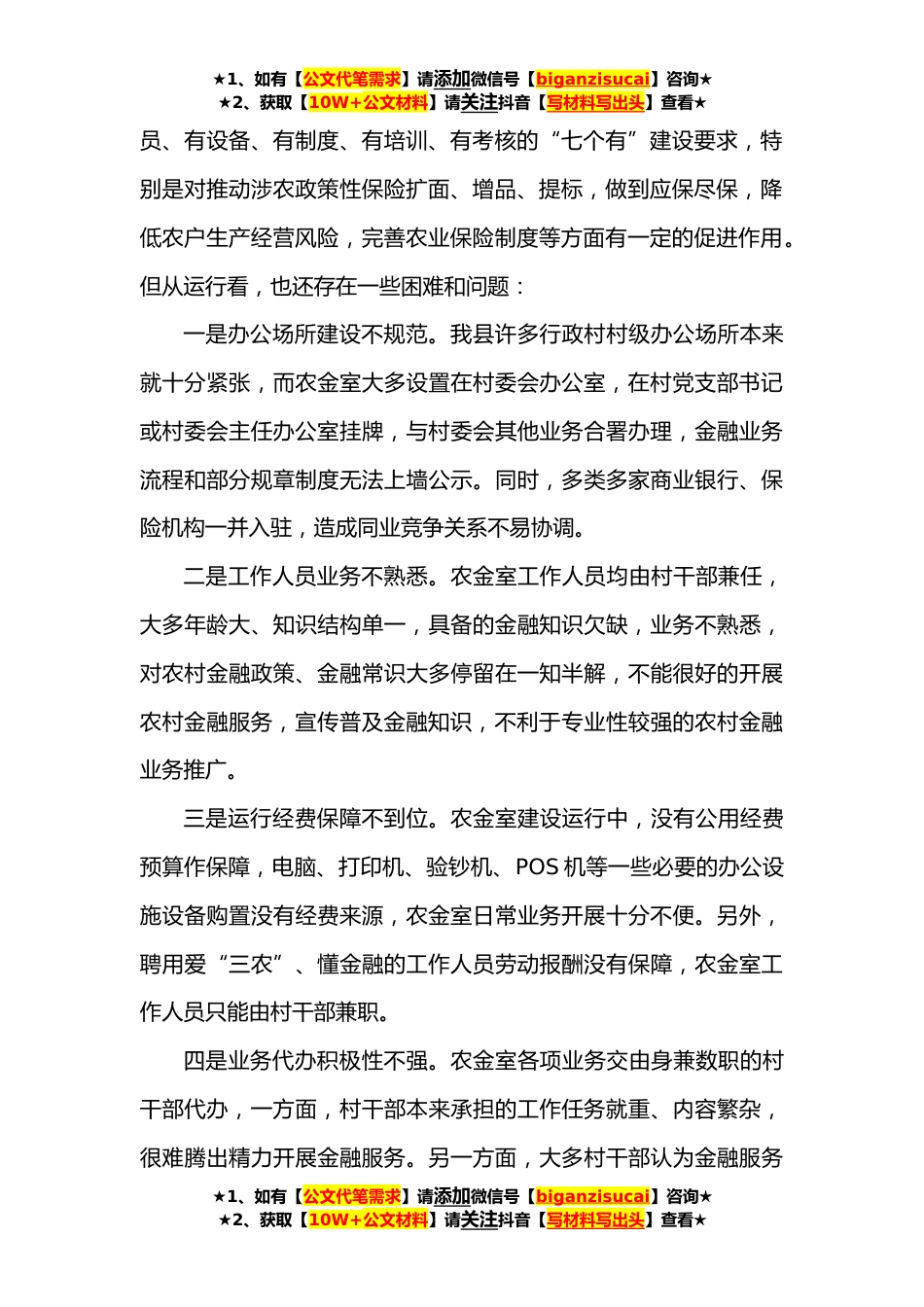 ★1、如有【公文代笔需求】请添加微信号【biganzisucai】咨询★★2、获取【10W+公文材料】请关注抖音【写材料写出头】查看★农村金融综合服务室规范化建设情况调研报告根据省政府关于加快推进农村金融综合服务站(室)建设的有关要求,我县按照“一镇一站、一村一室、集中统一、综合服务”的建设原则,各乡镇依托原有经管站设立乡镇金融服务站,站长由乡镇经管站负责同志兼任,各行政村依托现有农村金融服务网点和村委会办公室建立农村金融综合服务室,主任由各行政村党支部书记或村委会主任担任。至目前,全县**个乡镇已全部成立农村金融服务站并配备了站长和工作人员,**个行政村根据行程距离和人口密度,统筹建立农村金融综合服务室**个,并配备了主任、指导员和工作人员,做到了金融机构**入驻。但在实际运行...