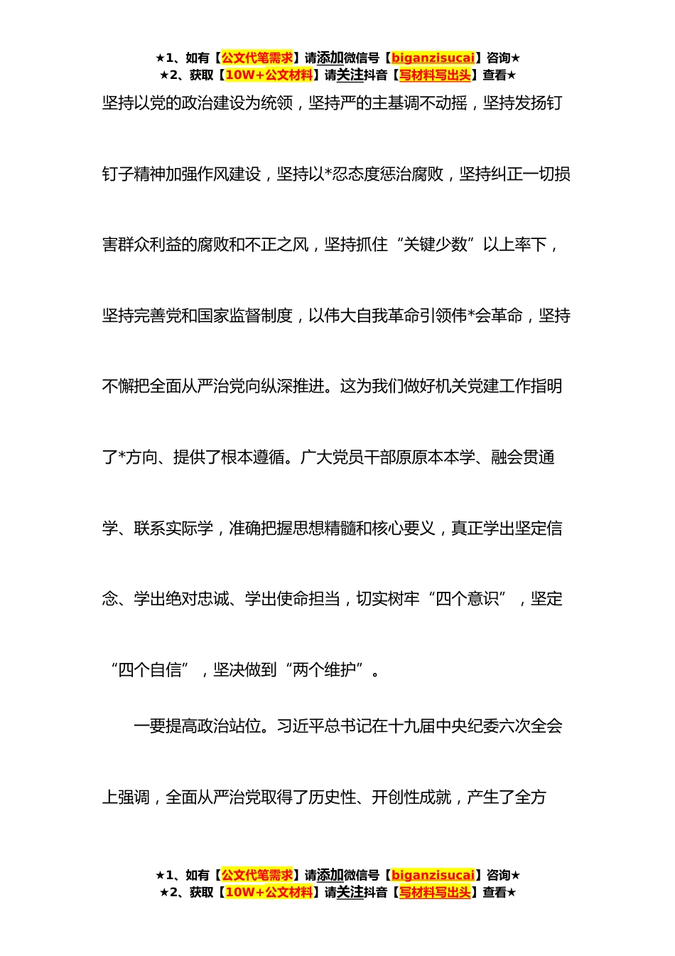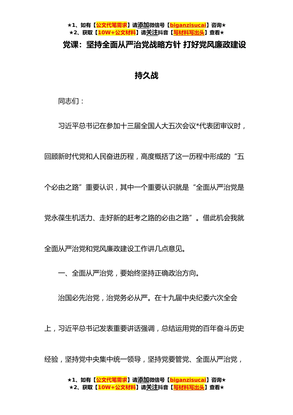 ★1、如有【公文代笔需求】请添加微信号【biganzisucai】咨询★★2、获取【10W+公文材料】请关注抖音【写材料写出头】查看★党课:坚持全面从严治党战略方针打好党风廉政建设持久战同志们:习近平总书记在参加十三届全国人大五次会议*代表团审议时,回顾新时代党和人民奋进历程,高度概括了这一历程中形成的“五个必由之路”重要认识,其中一个重要认识就是“全面从严治党是党永葆生机活力、走好新的赶考之路的必由之路”。借此机会我就全面从严治党和党风廉政建设工作讲几点意见。一、全面从严治党,要始终坚持正确政治方向。治国必先治党,治党务必从严。在十九届中央纪委六次全会上,习近平总书记发表重要讲话强调,总结运用党的百年奋斗历史经验,坚持党中央集中统一领导,坚持党要管党、全面从严治党,★1、...