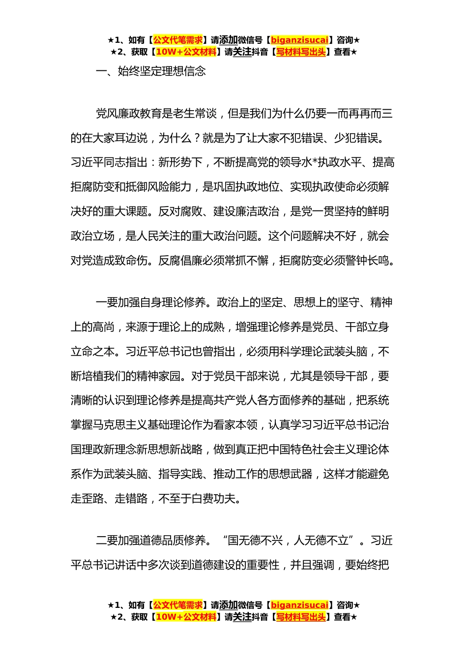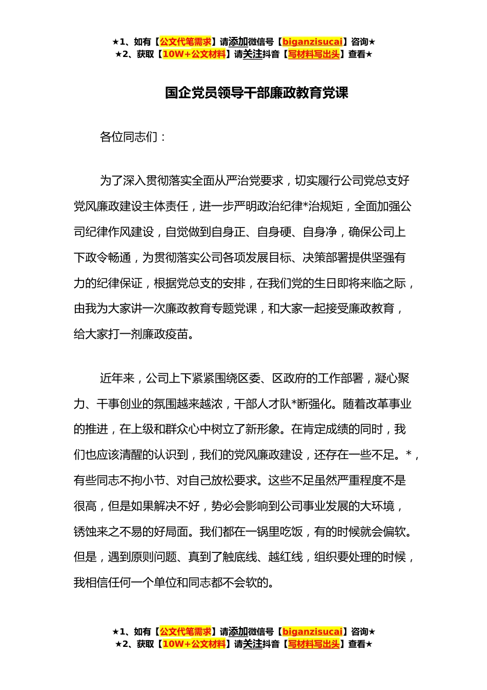 ★1、如有【公文代笔需求】请添加微信号【biganzisucai】咨询★★2、获取【10W+公文材料】请关注抖音【写材料写出头】查看★国企党员领导干部廉政教育党课各位同志们:为了深入贯彻落实全面从严治党要求,切实履行公司党总支好党风廉政建设主体责任,进一步严明政治纪律*治规矩,全面加强公司纪律作风建设,自觉做到自身正、自身硬、自身净,确保公司上下政令畅通,为贯彻落实公司各项发展目标、决策部署提供坚强有力的纪律保证,根据党总支的安排,在我们党的生日即将来临之际,由我为大家讲一次廉政教育专题党课,和大家一起接受廉政教育,给大家打一剂廉政疫苗。近年来,公司上下紧紧围绕区委、区政府的工作部署,凝心聚力、干事创业的氛围越来越浓,干部人才队*断强化。随着改革事业的推进,在上级和群众心中...