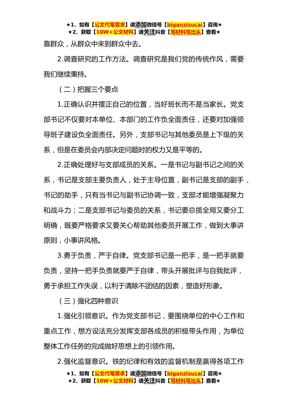 ★1、如有【公文代笔需求】请添加微信号【biganzisucai】咨询★★2、获取【10W+公文材料】请关注抖音【写材料写出头】查看★新时代如何做好一名党支部书记专题党课讲稿党支部是基层单位党建工作的重要支撑,对于党建工作的实际效果有着重要的影响,而党支部书记是党支部的核心人物,是领导班子的班长。作为党支部书记,我们的素质能力、领导水平、工作方法、工作作风,很大程度上决定着基层党组织建设的状况,影响着党支部的战斗堡垒作用和党员先锋模范作用的发挥。一、党支部书记的职务特点(一)党支部书记是支部建设的表率和带头之人。党支部书记是基层党组织的核心人物,必须具有高度的事业心和责任感,较强的组织领导能力,丰富的基层工作经验。能在工作和生活中发扬党的优良传统和作风,为党员和群众做出表...