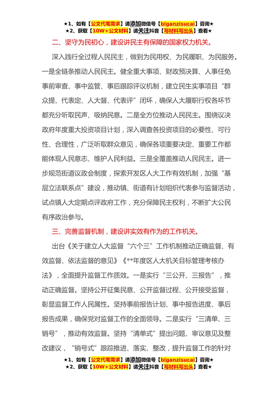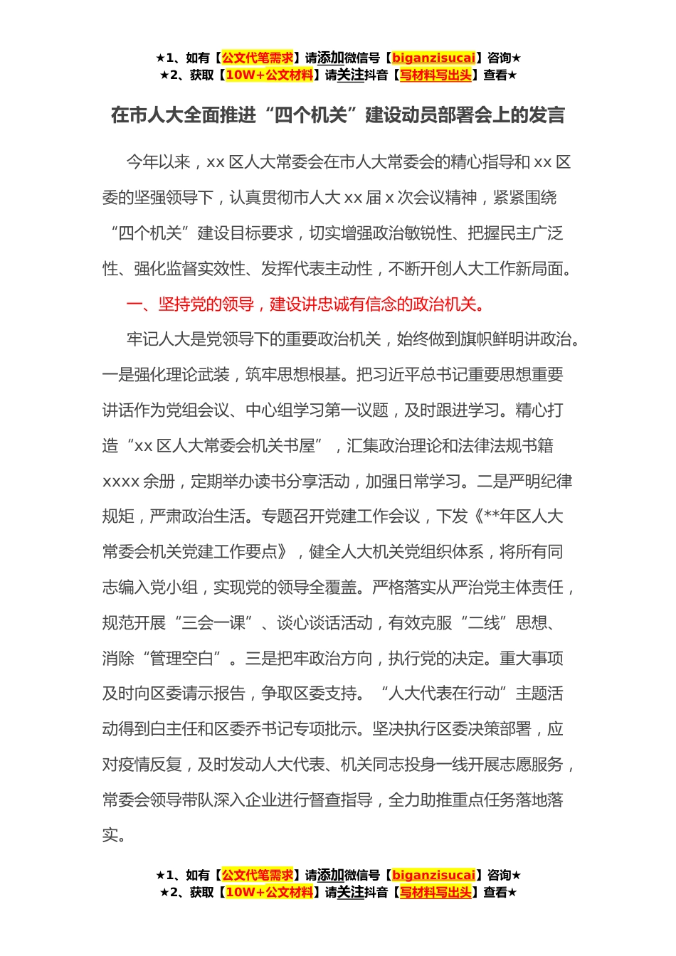 ★1、如有【公文代笔需求】请添加微信号【biganzisucai】咨询★★2、获取【10W+公文材料】请关注抖音【写材料写出头】查看★在市人大全面推进“四个机关”建设动员部署会上的发言今年以来,xx区人大常委会在市人大常委会的精心指导和xx区委的坚强领导下,认真贯彻市人大xx届x次会议精神,紧紧围绕“四个机关”建设目标要求,切实增强政治敏锐性、把握民主广泛性、强化监督实效性、发挥代表主动性,不断开创人大工作新局面。一、坚持党的领导,建设讲忠诚有信念的政治机关。牢记人大是党领导下的重要政治机关,始终做到旗帜鲜明讲政治。一是强化理论武装,筑牢思想根基。把习近平总书记重要思想重要讲话作为党组会议、中心组学习第一议题,及时跟进学习。精心打造“xx区人大常委会机关书屋”,汇集政治理论和法律法...