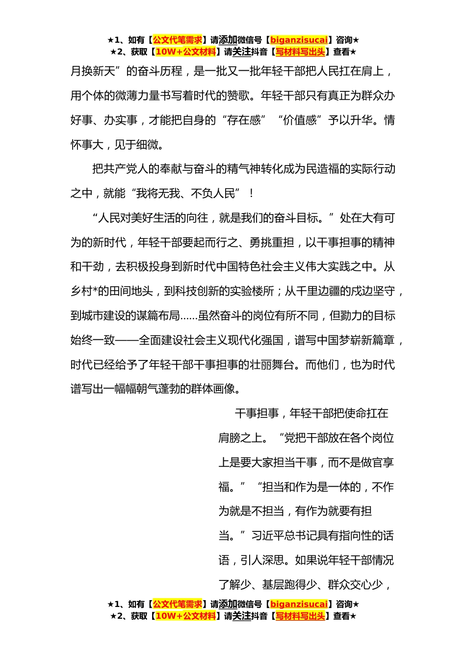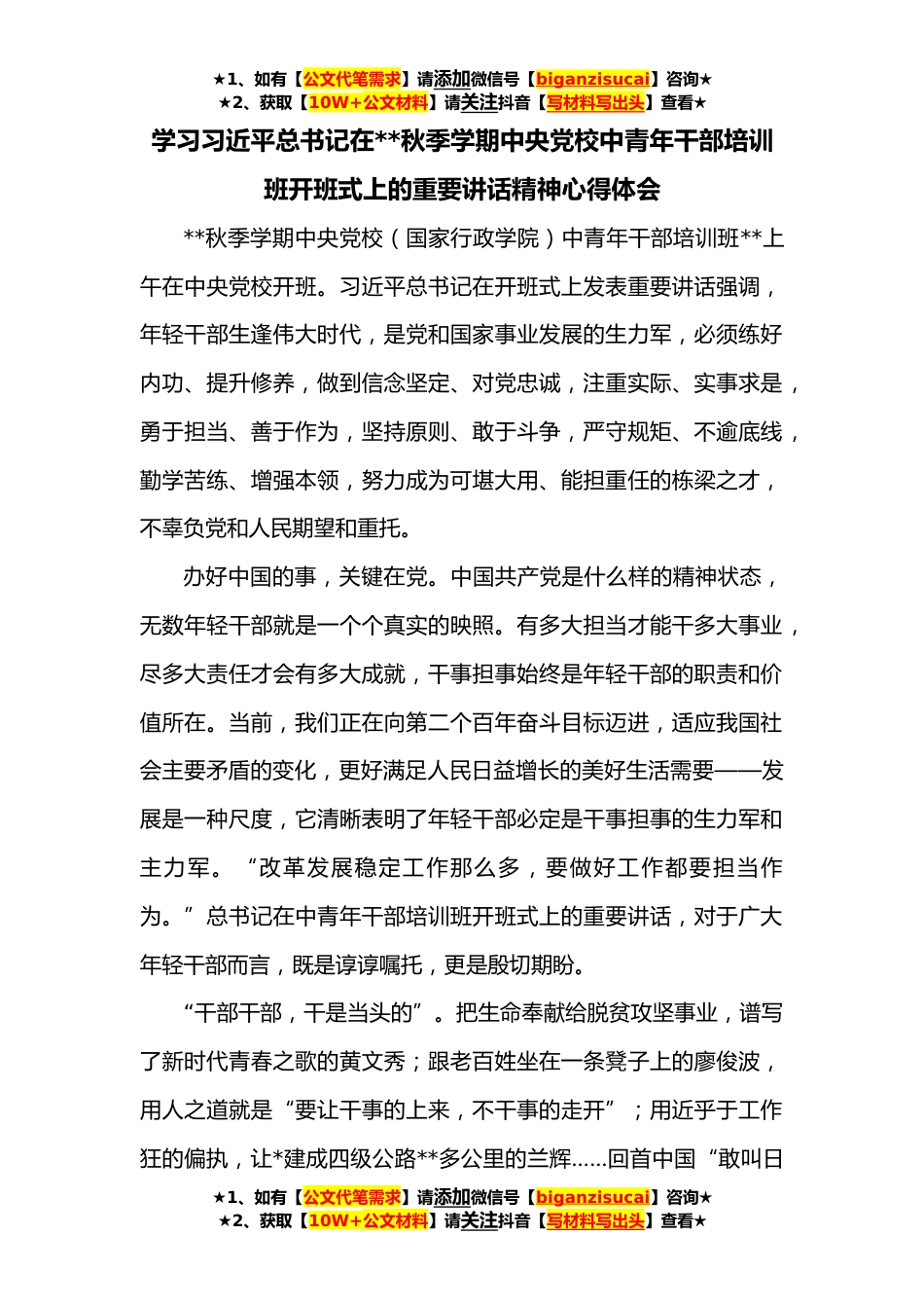 ★1、如有【公文代笔需求】请添加微信号【biganzisucai】咨询★★2、获取【10W+公文材料】请关注抖音【写材料写出头】查看★学习习近平总书记在**秋季学期中央党校中青年干部培训班开班式上的重要讲话精神心得体会**秋季学期中央党校(国家行政学院)中青年干部培训班**上午在中央党校开班。习近平总书记在开班式上发表重要讲话强调,年轻干部生逢伟大时代,是党和国家事业发展的生力军,必须练好内功、提升修养,做到信念坚定、对党忠诚,注重实际、实事求是,勇于担当、善于作为,坚持原则、敢于斗争,严守规矩、不逾底线,勤学苦练、增强本领,努力成为可堪大用、能担重任的栋梁之才,不辜负党和人民期望和重托。办好中国的事,关键在党。中国共产党是什么样的精神状态,无数年轻干部就是一个个真实的映照。有...