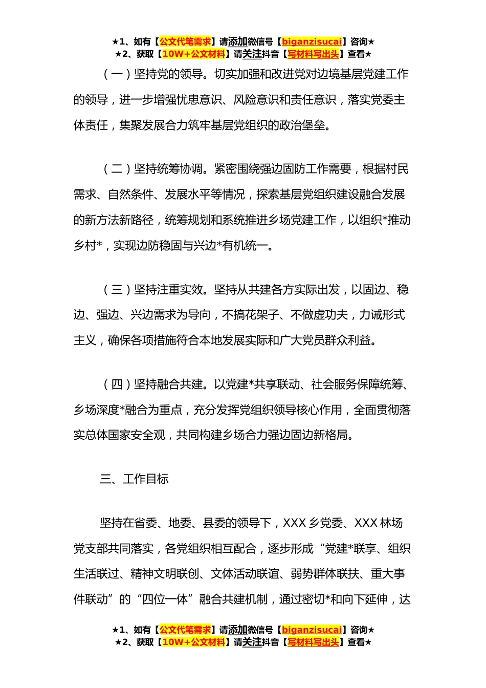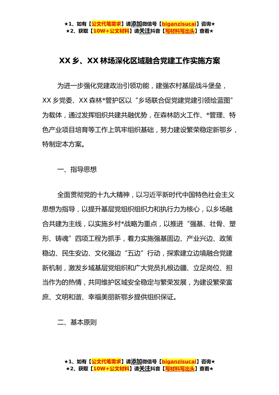 ★1、如有【公文代笔需求】请添加微信号【biganzisucai】咨询★★2、获取【10W+公文材料】请关注抖音【写材料写出头】查看★XX乡、XX林场深化区域融合党建工作实施方案为进一步强化党建政治引领功能,建强农村基层战斗堡垒,XX乡党委、XX森林*管护区以“乡场联合促党建党建引领绘蓝图”为载体,通过发挥组织共建共融优势,在森林防火工作、*管理、特色产业项目培育等工作上筑牢组织基础,努力建设繁荣稳定新鄂乡,特制定本方案。一、指导思想全面贯彻党的十九大精神,以习近平新时代中国特色社会主义思想为指导,以提升基层党组织组织力和执行力为核心,以乡场融合共建为主线,以实施乡村*战略为重点,以推进“强基、壮骨、塑形、铸魂”四项工程为抓手,着力实施强基固边、产业兴边、政策稳边、民生安边、文化强边...