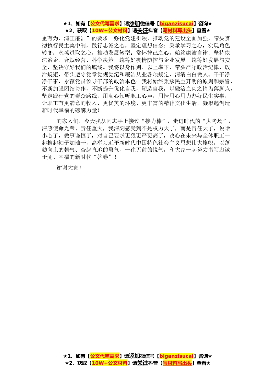 ★1、如有【公文代笔需求】请添加微信号【biganzisucai】咨询★★2、获取【10W+公文材料】请关注抖音【写材料写出头】查看★衷心感谢部长送我到履新、感谢党组织和领导的培养与信任,本人完全拥护组织的决定,坚决服从组织的安排,按集团公司党委的决策部署和集团公司领导的讲话精神、工作要求抓好执行、抓好落实。,中华之,这个弘扬“干字当头拼字为先”精神的老国企,在我大学毕业之际就接纳了我、教育了我、培养了我,我在集团工作生活了年,从集团*冶金化工厂的技术员干到一把手,后来又到集团、集团工作,可以说年来从未脱离过工贸行业,深度与金属采选冶打交道,与结下了不解之缘,对怀着深厚的情怀。这次回到,既是组织的一份希望和重托,更是新的考验和挑战。我在此不求“镀金”不当“跳板”,但求能够倾...