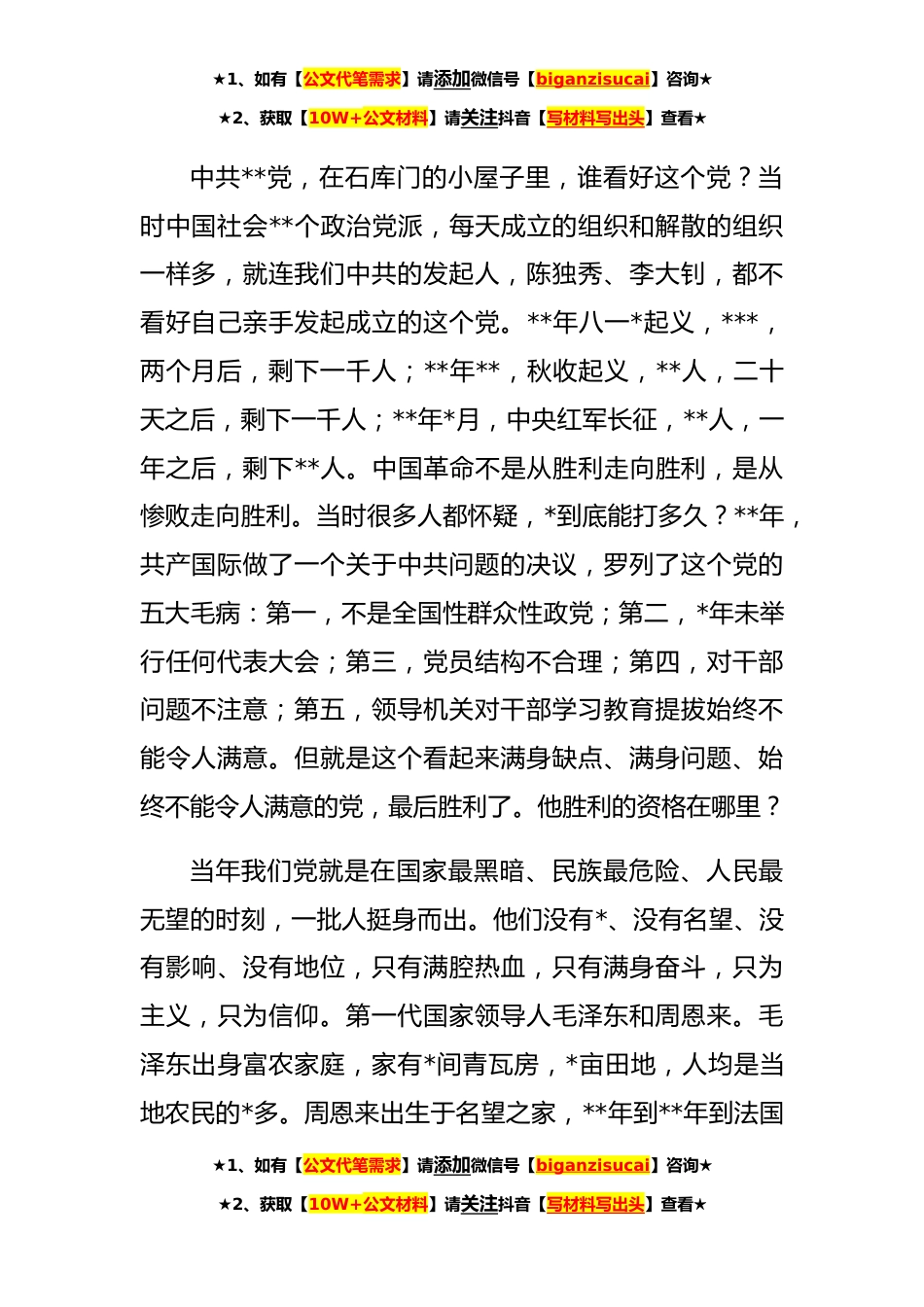 ★1、如有【公文代笔需求】请添加微信号【biganzisucai】咨询★★2、获取【10W+公文材料】请关注抖音【写材料写出头】查看★局长理想信念党课讲稿:我们的时代我们的样子习近平同志强调:“中国共产党是世界上最大的政党。大就要有大的样子。”我经常想,我们从哪里来?我们是怎么过来的?我们一路走来的样子是什么?我们从革命中走来,不怕死、跟我上就是我们的样子;我们从建设中走来,不惧苦、干在前就是我们的样子;我们从改革开放中走来,不畏难、敢担当就是我们的样子;我们从为民族谋*为人民谋幸福中走来,不忘本、守初心、担使命就是我们的样子。那么,具体体现在每一名党员每一名XX的样子上,是什么?习总书记要求,建设铁一般的理想信念、铁一般的责任担当、铁一般的过硬本领、铁一般的纪律作风的XX铁军...