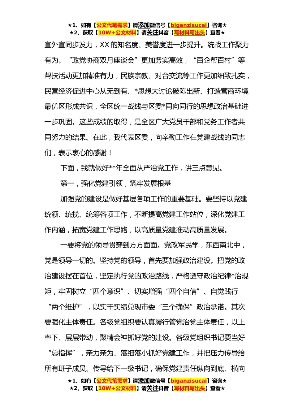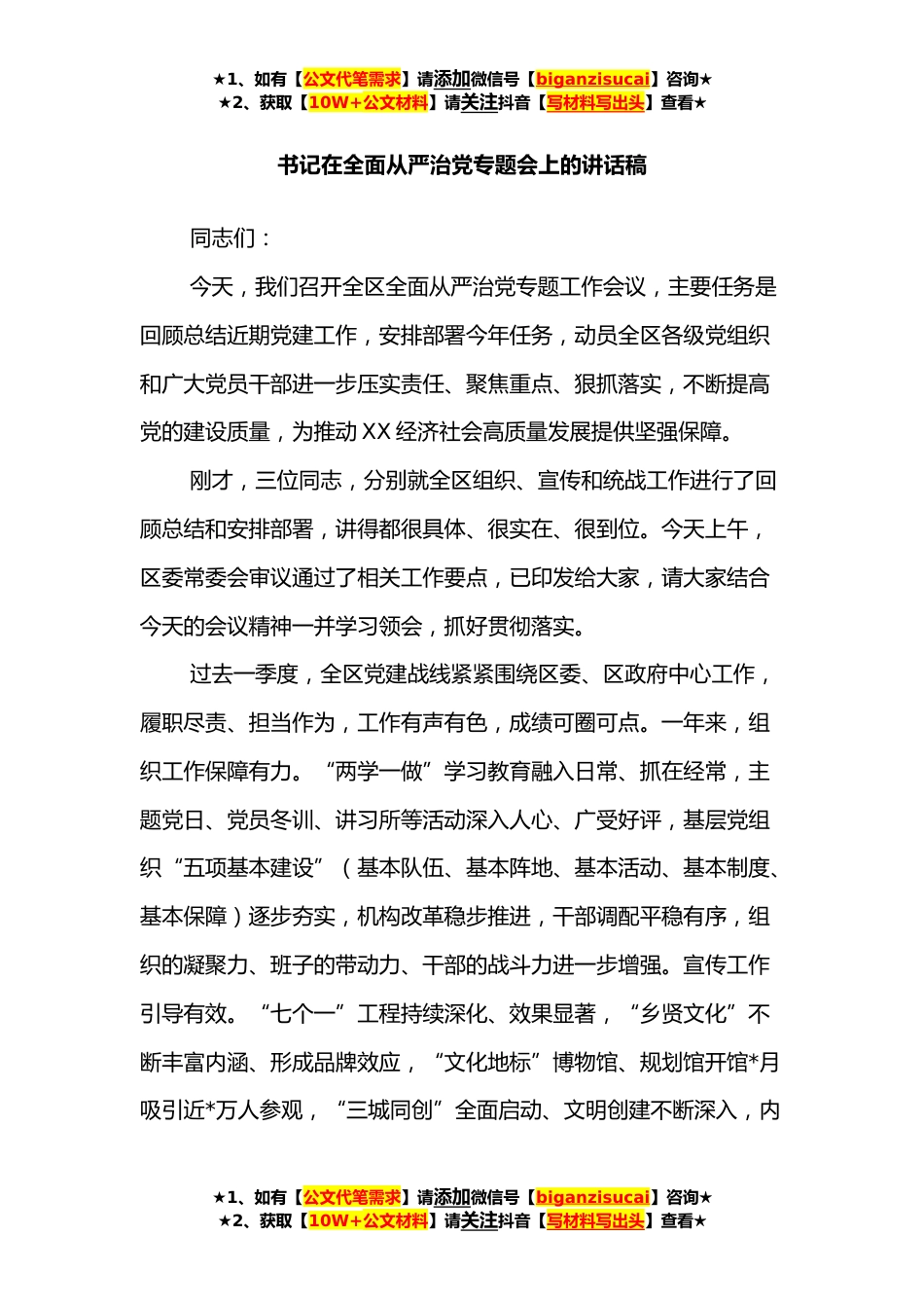 ★1、如有【公文代笔需求】请添加微信号【biganzisucai】咨询★★2、获取【10W+公文材料】请关注抖音【写材料写出头】查看★书记在全面从严治党专题会上的讲话稿同志们:今天,我们召开全区全面从严治党专题工作会议,主要任务是回顾总结近期党建工作,安排部署今年任务,动员全区各级党组织和广大党员干部进一步压实责任、聚焦重点、狠抓落实,不断提高党的建设质量,为推动XX经济社会高质量发展提供坚强保障。刚才,三位同志,分别就全区组织、宣传和统战工作进行了回顾总结和安排部署,讲得都很具体、很实在、很到位。今天上午,区委常委会审议通过了相关工作要点,已印发给大家,请大家结合今天的会议精神一并学习领会,抓好贯彻落实。过去一季度,全区党建战线紧紧围绕区委、区政府中心工作,履职尽责、担当...