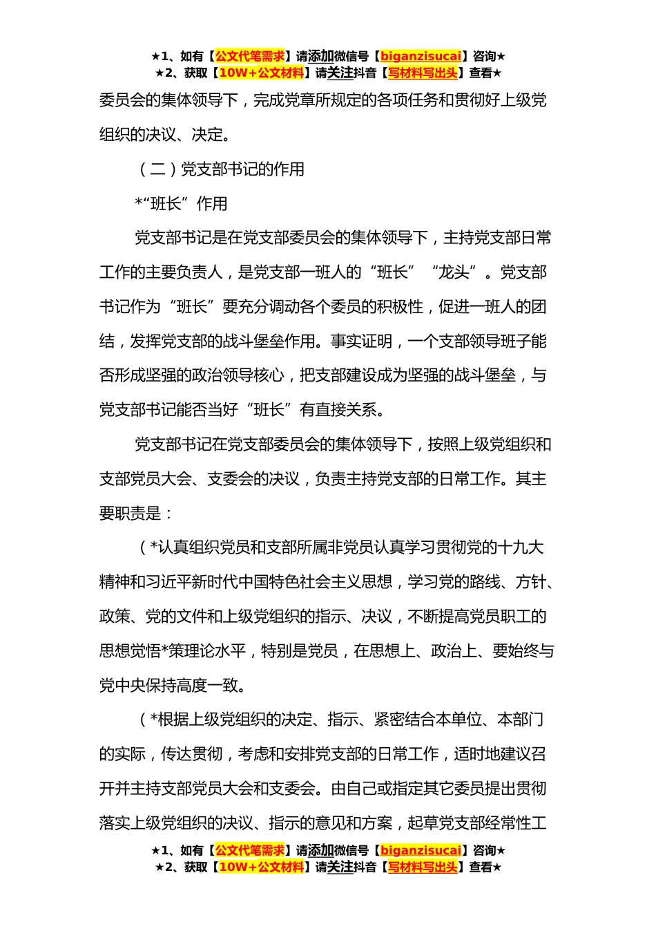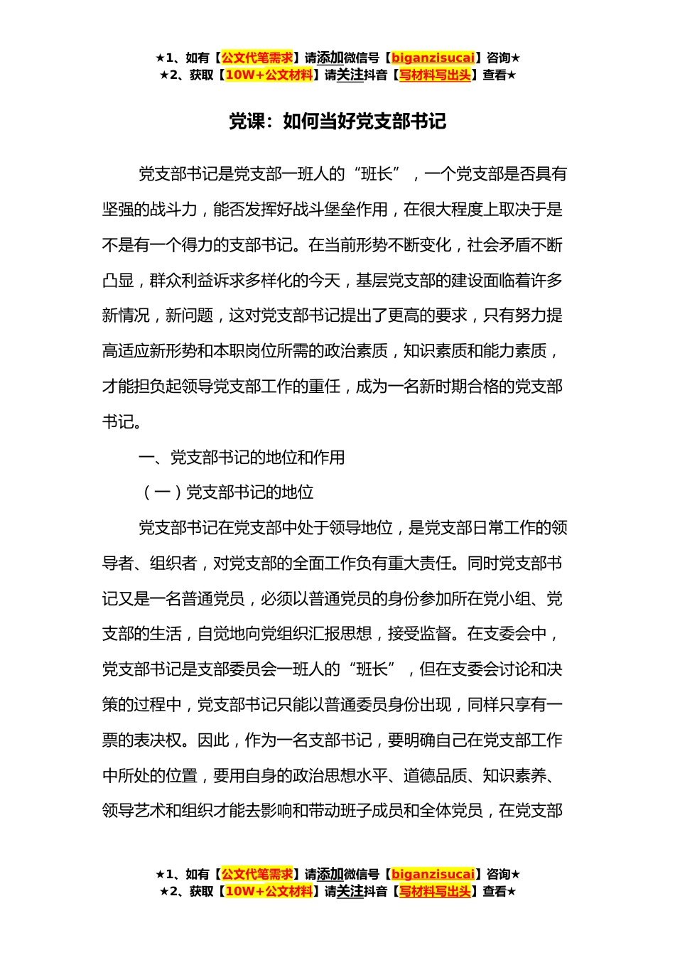 ★1、如有【公文代笔需求】请添加微信号【biganzisucai】咨询★★2、获取【10W+公文材料】请关注抖音【写材料写出头】查看★党课:如何当好党支部书记党支部书记是党支部一班人的“班长”,一个党支部是否具有坚强的战斗力,能否发挥好战斗堡垒作用,在很大程度上取决于是不是有一个得力的支部书记。在当前形势不断变化,社会矛盾不断凸显,群众利益诉求多样化的今天,基层党支部的建设面临着许多新情况,新问题,这对党支部书记提出了更高的要求,只有努力提高适应新形势和本职岗位所需的政治素质,知识素质和能力素质,才能担负起领导党支部工作的重任,成为一名新时期合格的党支部书记。一、党支部书记的地位和作用(一)党支部书记的地位党支部书记在党支部中处于领导地位,是党支部日常工作的领导者、组织者...