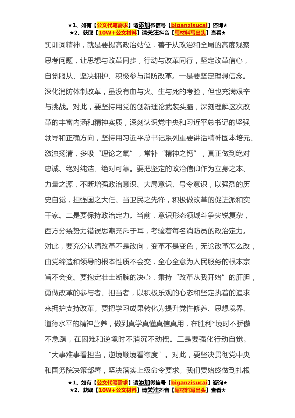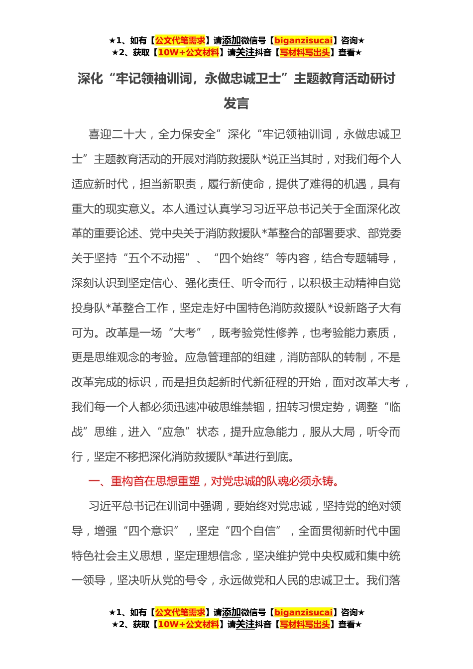 ★1、如有【公文代笔需求】请添加微信号【biganzisucai】咨询★★2、获取【10W+公文材料】请关注抖音【写材料写出头】查看★深化“牢记领袖训词,永做忠诚卫士”主题教育活动研讨发言喜迎二十大,全力保安全”深化“牢记领袖训词,永做忠诚卫士”主题教育活动的开展对消防救援队*说正当其时,对我们每个人适应新时代,担当新职责,履行新使命,提供了难得的机遇,具有重大的现实意义。本人通过认真学习习近平总书记关于全面深化改革的重要论述、党中央关于消防救援队*革整合的部署要求、部党委关于坚持“五个不动摇”、“四个始终”等内容,结合专题辅导,深刻认识到坚定信心、强化责任、听令而行,以积极主动精神自觉投身队*革整合工作,坚定走好中国特色消防救援队*设新路子大有可为。改革是一场“大考”,既考...