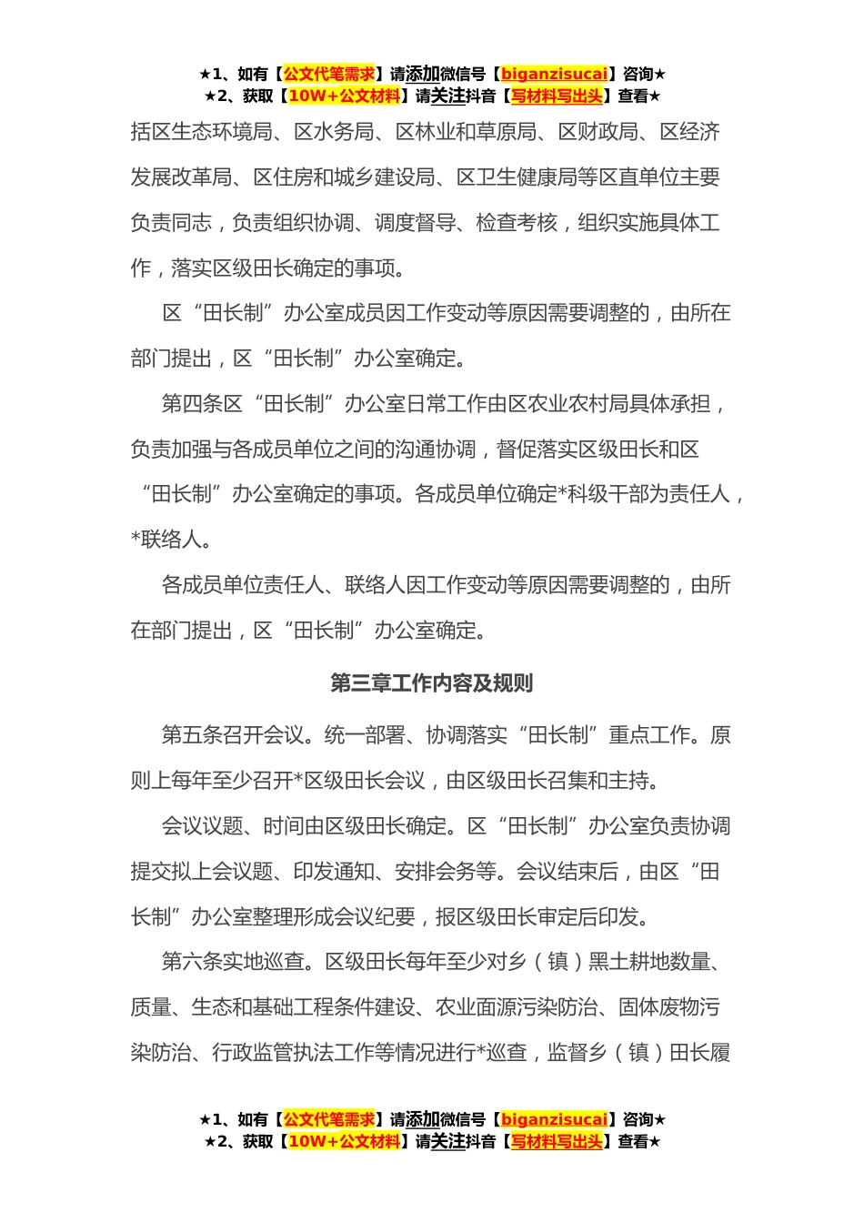 ★1、如有【公文代笔需求】请添加微信号【biganzisucai】咨询★★2、获取【10W+公文材料】请关注抖音【写材料写出头】查看★区级“田长制”工作规则(试行)第一章总则第一条为落实区级“田长制”工作,形成统筹组织、分工负责、合力推进、齐抓共管的黑土耕地保护利用局面,稳定黑土耕地数量,提升黑土耕地质量,改善黑土耕地生态,筑牢国家粮食安全“压舱石”基础,根据《中共xxx省委办公厅xxx省人民政府办公厅关于印发<xxx省黑土耕地保护利用“田长制”工作方案(试行)>的通知》(厅字[**xx号),《中共xx市委办公室xx市人民政府办公室关于印发<xx市黑土耕地保护利用“田长制”工作方案(试行)>的通知》(x字[**xx号),《中共大xx区委办公室xx区人民政府办公室关于印发<xx市xx区黑土耕地保护利用“田...