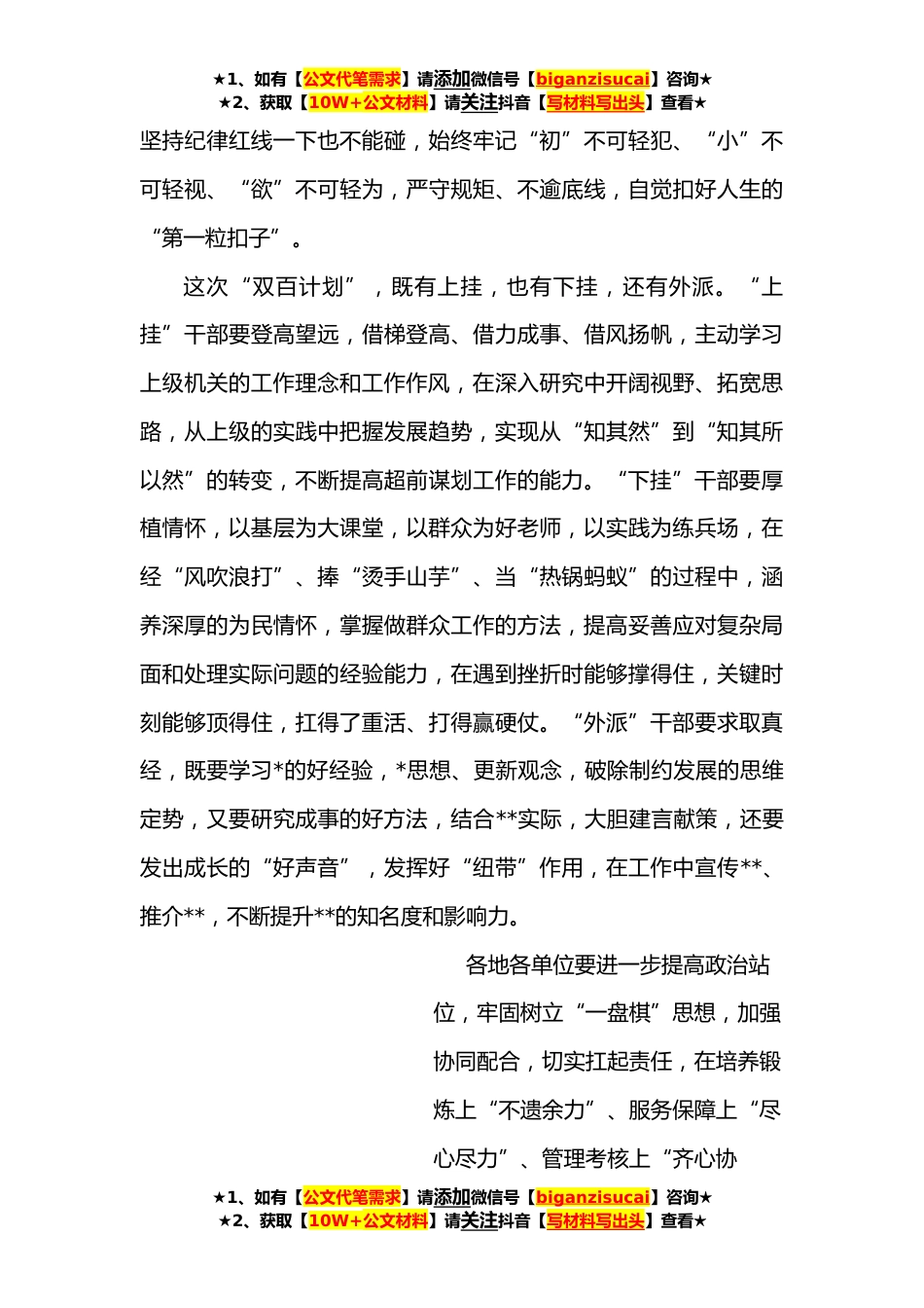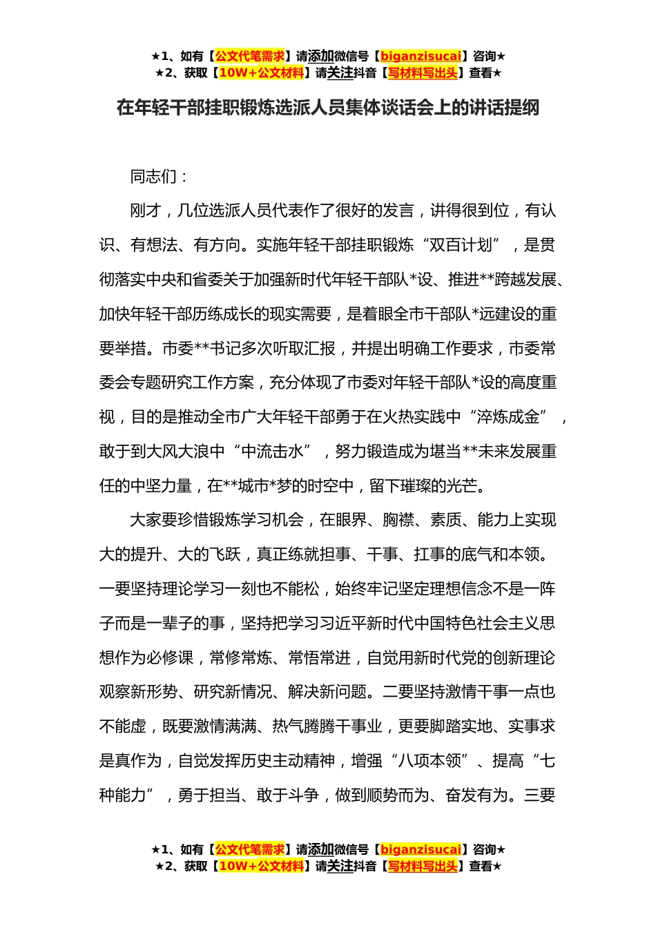 ★1、如有【公文代笔需求】请添加微信号【biganzisucai】咨询★★2、获取【10W+公文材料】请关注抖音【写材料写出头】查看★在年轻干部挂职锻炼选派人员集体谈话会上的讲话提纲同志们:刚才,几位选派人员代表作了很好的发言,讲得很到位,有认识、有想法、有方向。实施年轻干部挂职锻炼“双百计划”,是贯彻落实中央和省委关于加强新时代年轻干部队*设、推进**跨越发展、加快年轻干部历练成长的现实需要,是着眼全市干部队*远建设的重要举措。市委**书记多次听取汇报,并提出明确工作要求,市委常委会专题研究工作方案,充分体现了市委对年轻干部队*设的高度重视,目的是推动全市广大年轻干部勇于在火热实践中“淬炼成金”,敢于到大风大浪中“中流击水”,努力锻造成为堪当**未来发展重任的中坚力量,在**城市*...