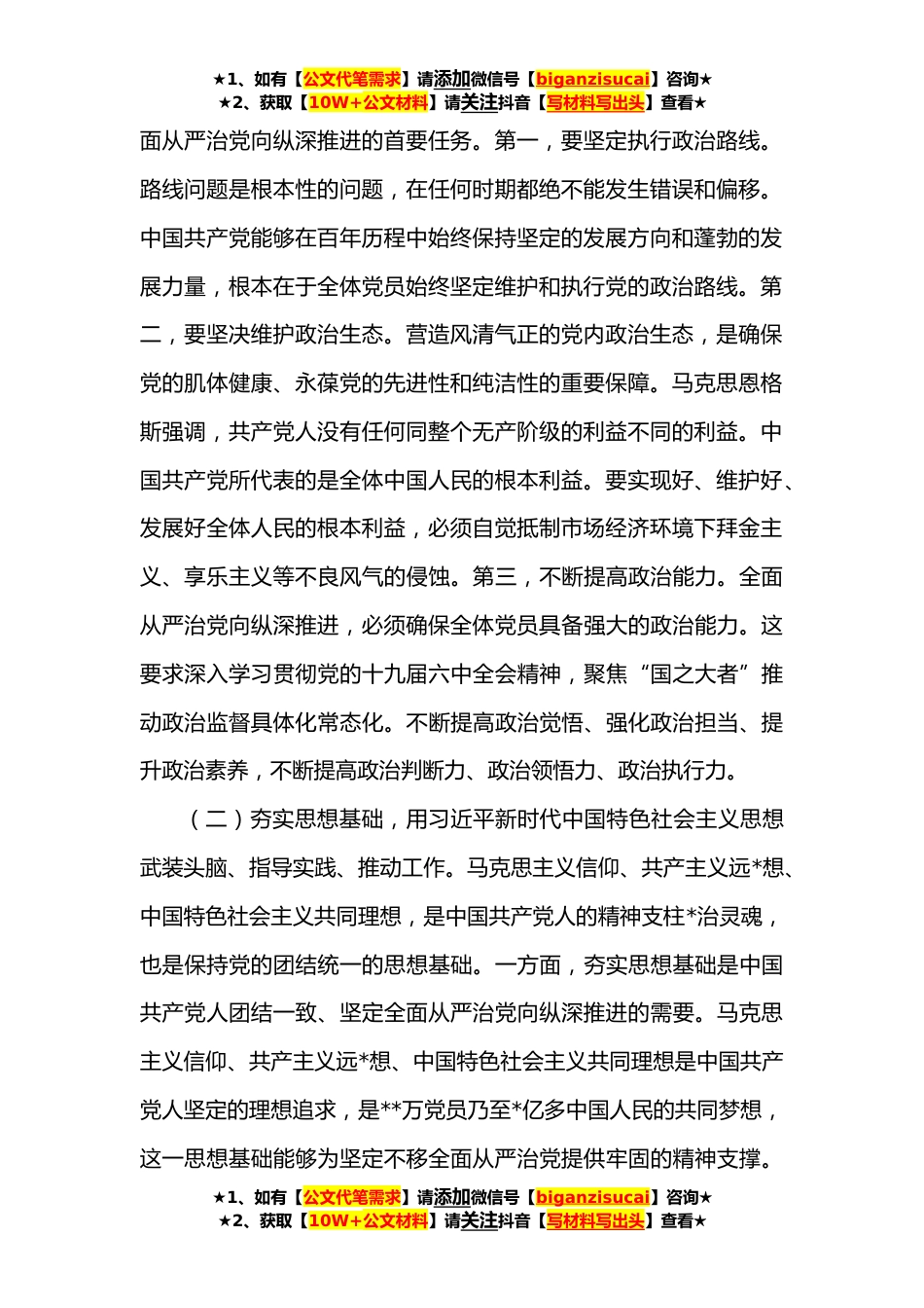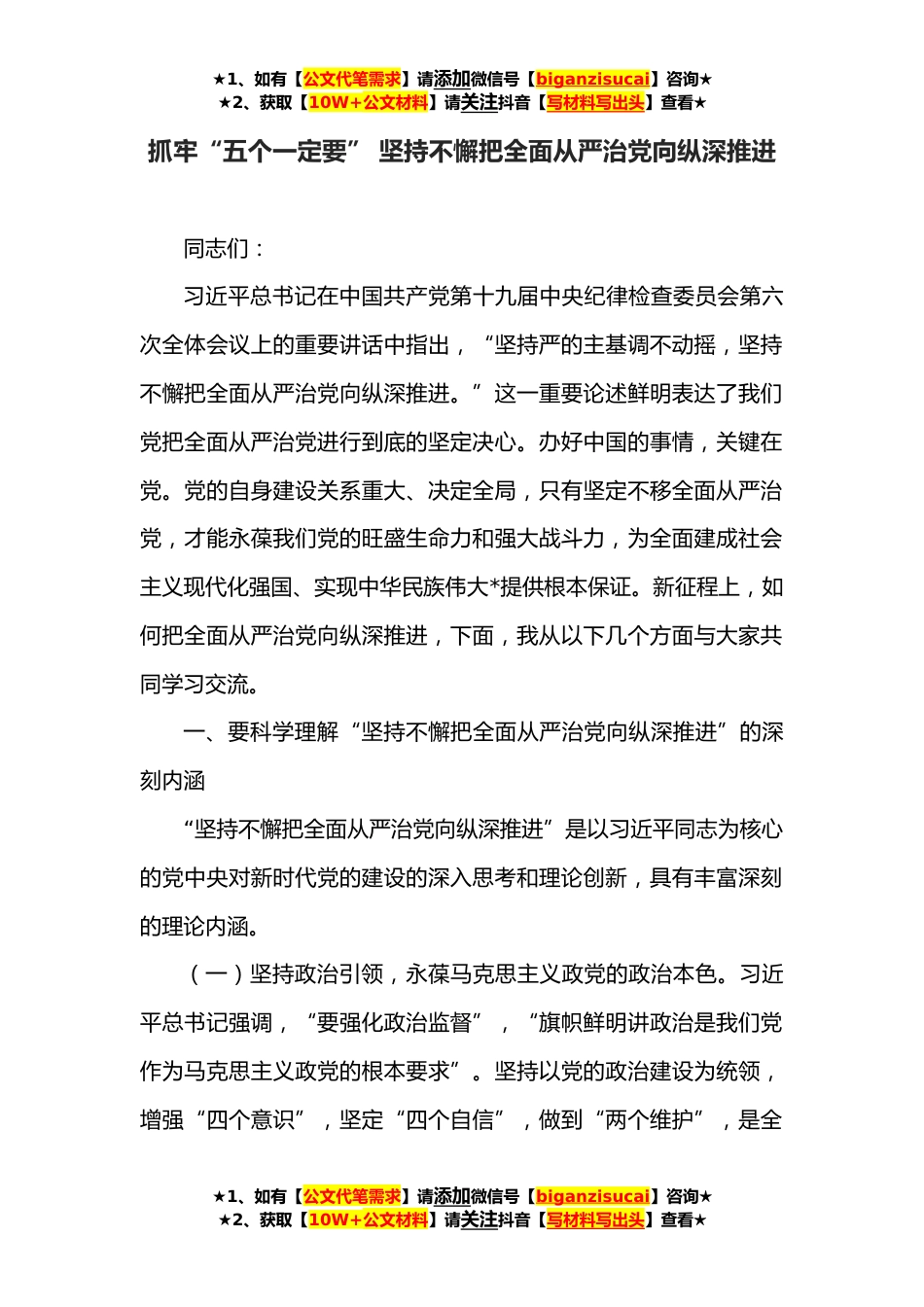 ★1、如有【公文代笔需求】请添加微信号【biganzisucai】咨询★★2、获取【10W+公文材料】请关注抖音【写材料写出头】查看★抓牢“五个一定要”坚持不懈把全面从严治党向纵深推进同志们:习近平总书记在中国共产党第十九届中央纪律检查委员会第六次全体会议上的重要讲话中指出,“坚持严的主基调不动摇,坚持不懈把全面从严治党向纵深推进。”这一重要论述鲜明表达了我们党把全面从严治党进行到底的坚定决心。办好中国的事情,关键在党。党的自身建设关系重大、决定全局,只有坚定不移全面从严治党,才能永葆我们党的旺盛生命力和强大战斗力,为全面建成社会主义现代化强国、实现中华民族伟大*提供根本保证。新征程上,如何把全面从严治党向纵深推进,下面,我从以下几个方面与大家共同学习交流。一、要科学理解“...