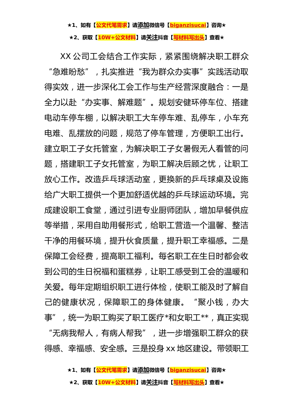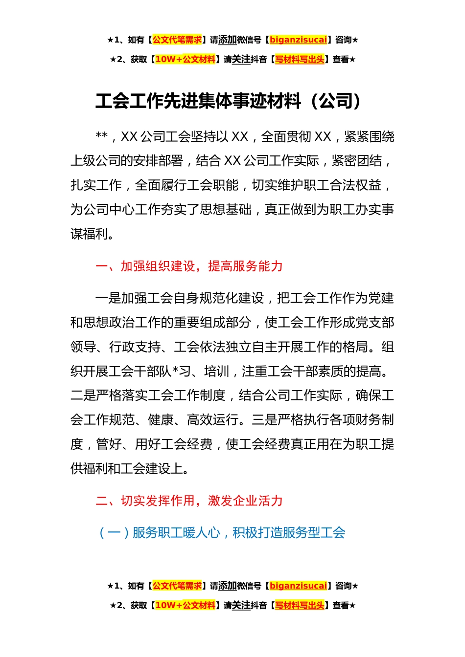 ★1、如有【公文代笔需求】请添加微信号【biganzisucai】咨询★★2、获取【10W+公文材料】请关注抖音【写材料写出头】查看★工会工作先进集体事迹材料(公司)**,XX公司工会坚持以XX,全面贯彻XX,紧紧围绕上级公司的安排部署,结合XX公司工作实际,紧密团结,扎实工作,全面履行工会职能,切实维护职工合法权益,为公司中心工作夯实了思想基础,真正做到为职工办实事谋福利。一、加强组织建设,提高服务能力一是加强工会自身规范化建设,把工会工作作为党建和思想政治工作的重要组成部分,使工会工作形成党支部领导、行政支持、工会依法独立自主开展工作的格局。组织开展工会干部队*习、培训,注重工会干部素质的提高。二是严格落实工会工作制度,结合公司工作实际,确保工会工作规范、健康、高效运行。三是严格...