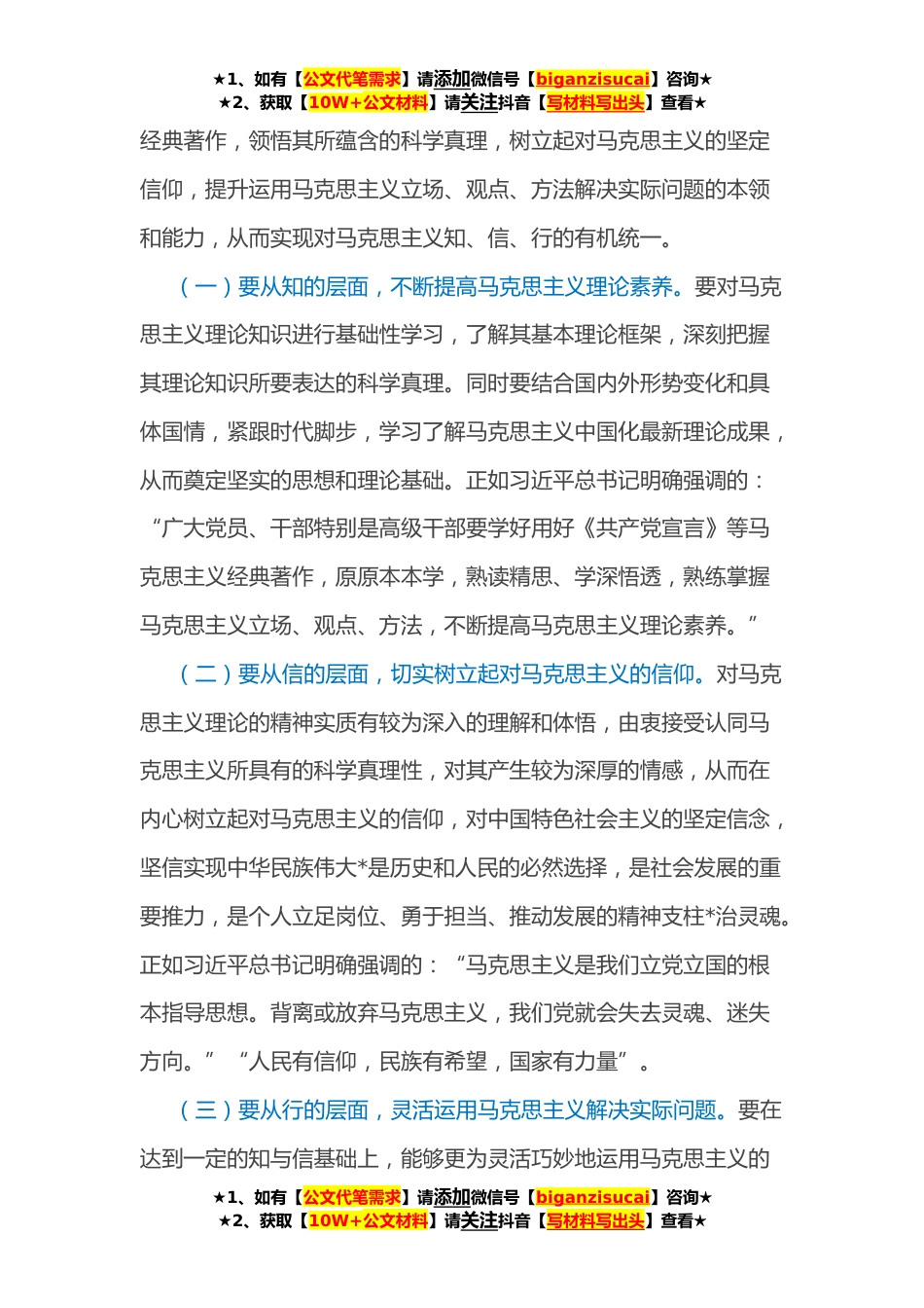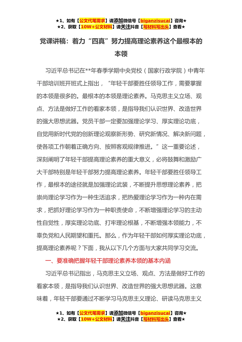 ★1、如有【公文代笔需求】请添加微信号【biganzisucai】咨询★★2、获取【10W+公文材料】请关注抖音【写材料写出头】查看★党课讲稿:着力“四真”努力提高理论素养这个最根本的本领习近平总书记在**年春季学期中央党校(国家行政学院)中青年干部培训班开班式上指出,“年轻干部要胜任领导工作,需要掌握的本领是很多的。最根本的本领是理论素养。马克思主义立场、观点、方法是做好工作的看家本领,是指导我们认识世界、改造世界的强大思想武器。党员干部一定要加强理论学习、厚实理论功底,自觉用新时代党的创新理论观察新形势、研究新情况、解决新问题,使各项工作朝着正确方向、按照客观规律推进。”这一重要论述,深刻阐明了年轻干部提高理论素养的重大意义,必将鼓舞和激励广大干部特别是年轻干部努力提高...