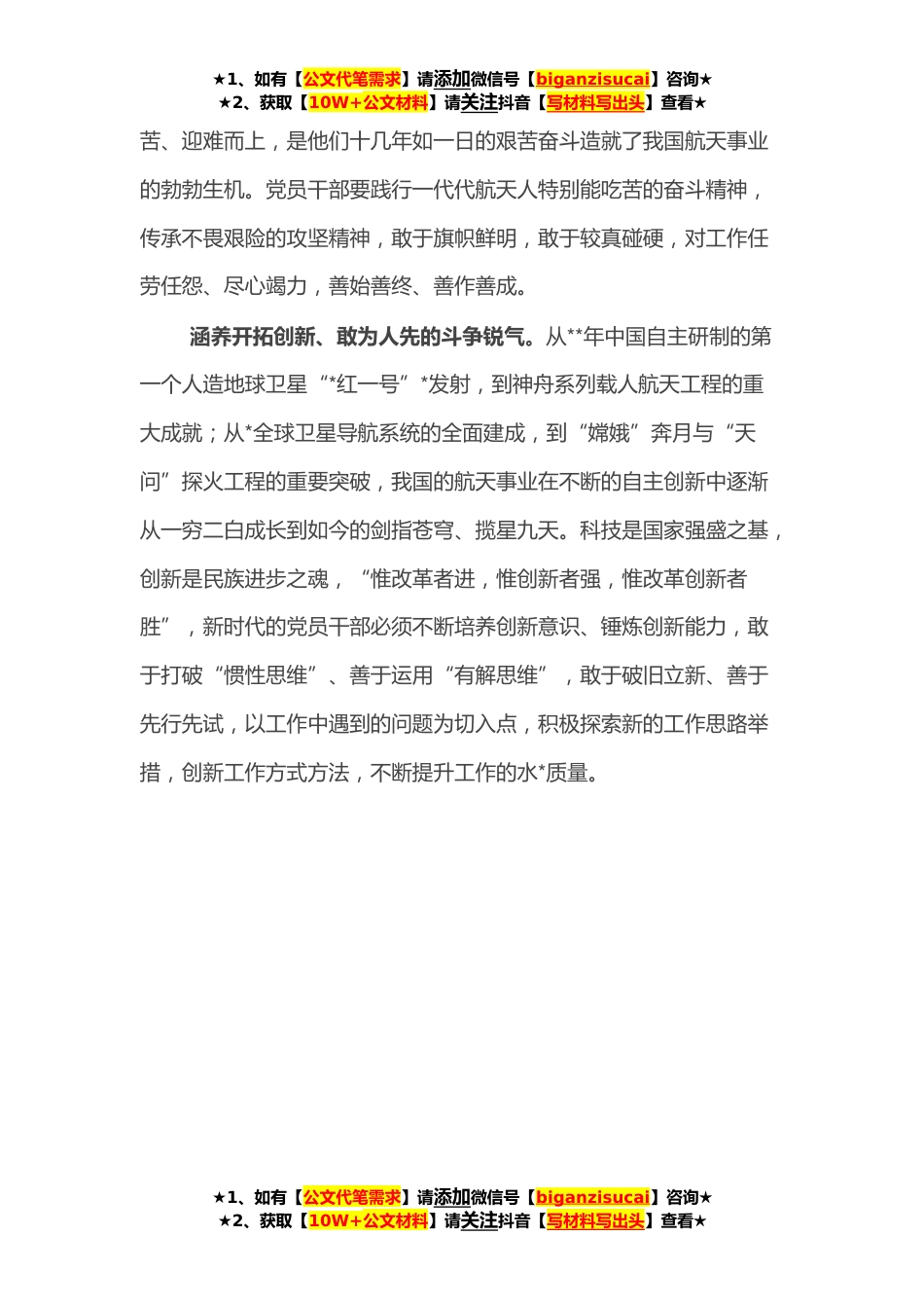 ★1、如有【公文代笔需求】请添加微信号【biganzisucai】咨询★★2、获取【10W+公文材料】请关注抖音【写材料写出头】查看★**,习近平总书记在五四青年节到来之际给中国航天科技集团空间站建造青年团队回信,勉励广大航天青年要弘扬“两弹一星”精神、载人航天精神,为航天科技实现高水平自立自强再立新功。从无到有、从弱到强,我国航天人在几十年的奋斗中,走出了一条自力更生、自主创新的发展道路,为坚持和发展中国特色社会主义增添了强大精神力量。作为新时代的党员干部,更要弘扬伟大的航天精神,始终保持自强不息、敢于拼搏的战斗劲头,擦亮吃苦耐劳、迎难而上的奋斗底色,涵养开拓创新、敢为人先的斗争锐气,一步一个脚印在实现为人民谋幸福、为民族谋*的道路上不懈努力。保持自强不息、敢于拼搏的战斗劲...