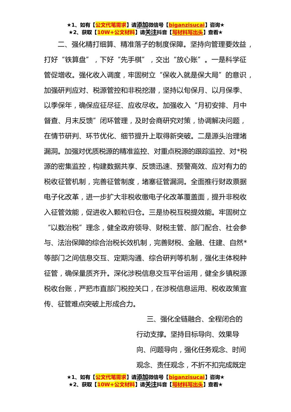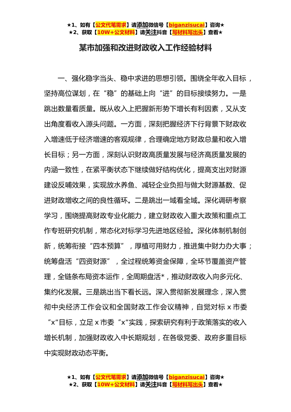 ★1、如有【公文代笔需求】请添加微信号【biganzisucai】咨询★★2、获取【10W+公文材料】请关注抖音【写材料写出头】查看★某市加强和改进财政收入工作经验材料一、强化稳字当头、稳中求进的思想引领。围绕全年收入目标,坚持高位谋划,在“稳”的基础上向“进”的目标接续努力。一是跳出数量看质量。既从收入上把握新形势下增长有利因素,又从支出角度看收入源头问题。一方面,深刻把握经济下行背景下财政收入增速低于经济增速的客观规律,合理确定地方财政总量和收入增长目标;另一方面,深刻认识财政高质量发展与经济高质量发展的内涵一致性,在紧平衡状态下继续做好结构优化,提高支出对财源建设反哺效果,实现放水养鱼、减轻企业负担与做大财源基数、促进财政增收之间的良性循环。二是跳出一域看全域。深化...