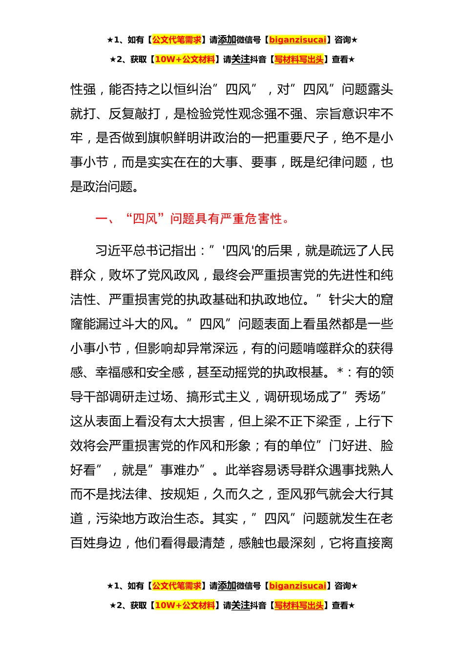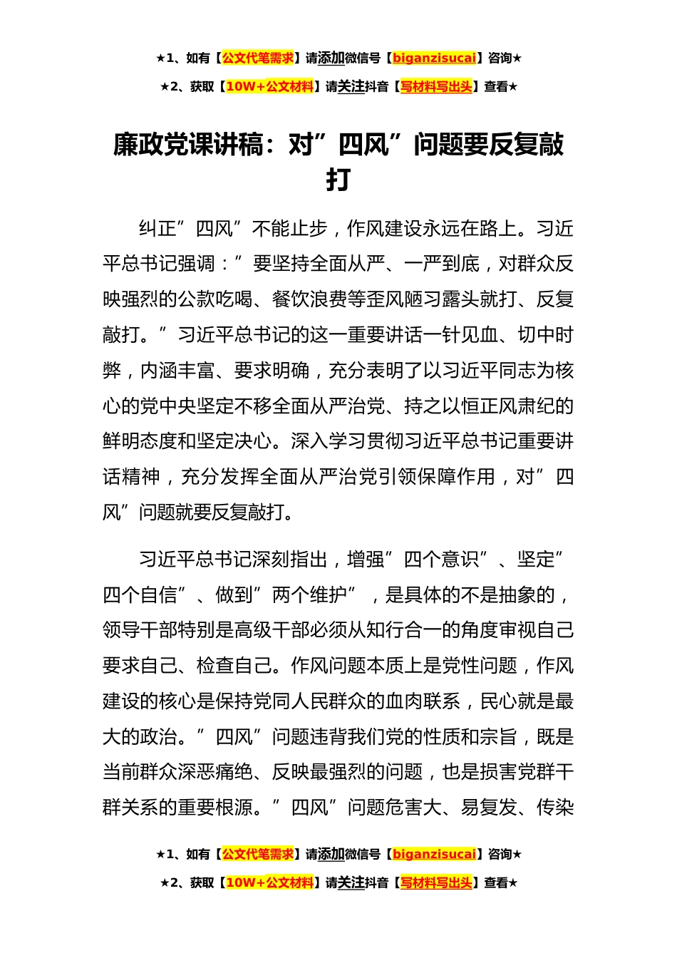 ★1、如有【公文代笔需求】请添加微信号【biganzisucai】咨询★★2、获取【10W+公文材料】请关注抖音【写材料写出头】查看★廉政党课讲稿:对”四风”问题要反复敲打纠正”四风”不能止步,作风建设永远在路上。习近平总书记强调:”要坚持全面从严、一严到底,对群众反映强烈的公款吃喝、餐饮浪费等歪风陋习露头就打、反复敲打。”习近平总书记的这一重要讲话一针见血、切中时弊,内涵丰富、要求明确,充分表明了以习近平同志为核心的党中央坚定不移全面从严治党、持之以恒正风肃纪的鲜明态度和坚定决心。深入学习贯彻习近平总书记重要讲话精神,充分发挥全面从严治党引领保障作用,对”四风”问题就要反复敲打。习近平总书记深刻指出,增强”四个意识”、坚定”四个自信”、做到”两个维护”,是具体的不是抽象...
