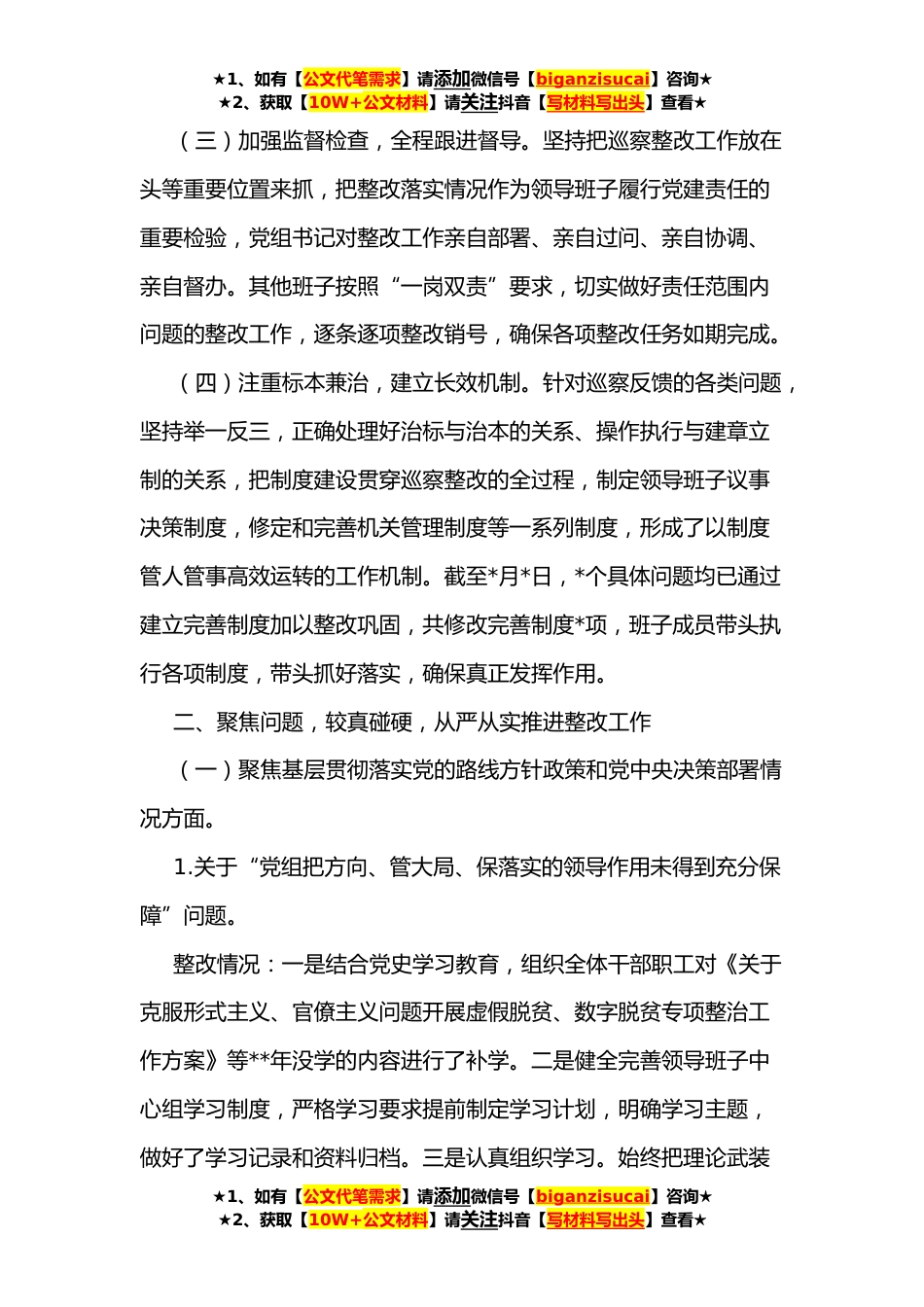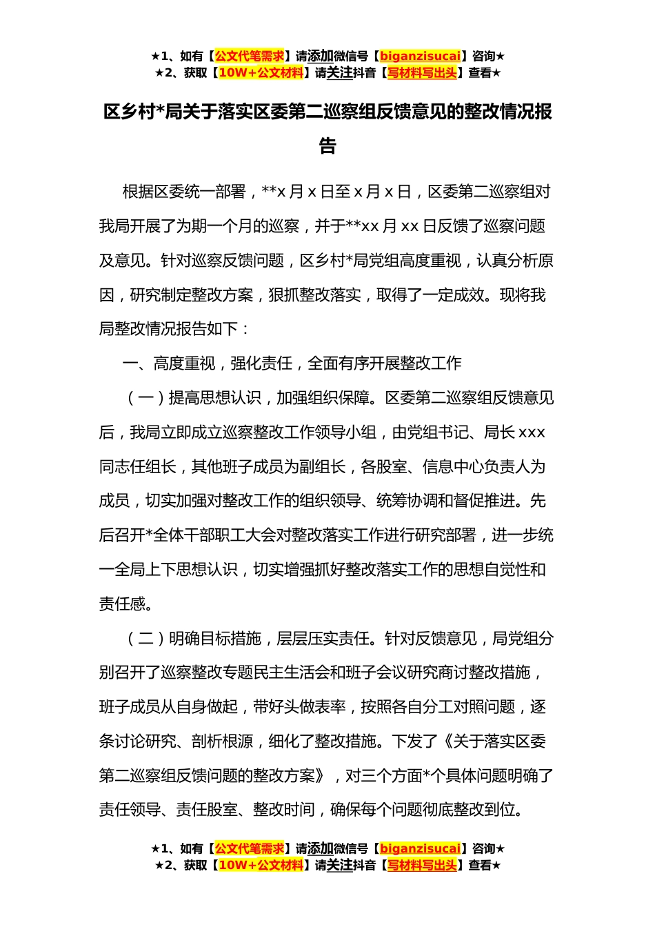 ★1、如有【公文代笔需求】请添加微信号【biganzisucai】咨询★★2、获取【10W+公文材料】请关注抖音【写材料写出头】查看★区乡村*局关于落实区委第二巡察组反馈意见的整改情况报告根据区委统一部署,**x月x日至x月x日,区委第二巡察组对我局开展了为期一个月的巡察,并于**xx月xx日反馈了巡察问题及意见。针对巡察反馈问题,区乡村*局党组高度重视,认真分析原因,研究制定整改方案,狠抓整改落实,取得了一定成效。现将我局整改情况报告如下:一、高度重视,强化责任,全面有序开展整改工作(一)提高思想认识,加强组织保障。区委第二巡察组反馈意见后,我局立即成立巡察整改工作领导小组,由党组书记、局长xxx同志任组长,其他班子成员为副组长,各股室、信息中心负责人为成员,切实加强对整改工作的组织领导...
