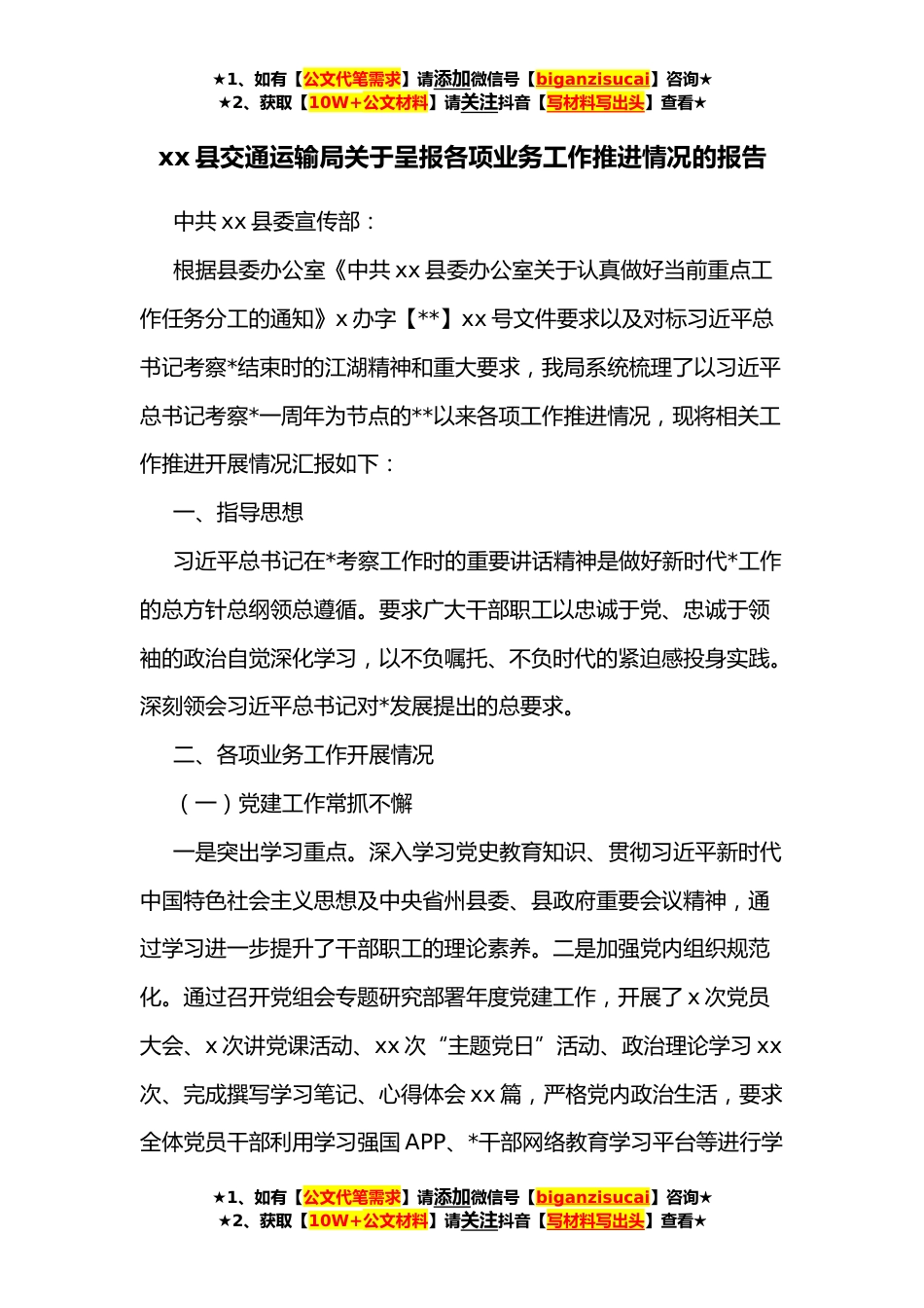 ★1、如有【公文代笔需求】请添加微信号【biganzisucai】咨询★★2、获取【10W+公文材料】请关注抖音【写材料写出头】查看★xx县交通运输局关于呈报各项业务工作推进情况的报告中共xx县委宣传部:根据县委办公室《中共xx县委办公室关于认真做好当前重点工作任务分工的通知》x办字【**】xx号文件要求以及对标习近平总书记考察*结束时的江湖精神和重大要求,我局系统梳理了以习近平总书记考察*一周年为节点的**以来各项工作推进情况,现将相关工作推进开展情况汇报如下:一、指导思想习近平总书记在*考察工作时的重要讲话精神是做好新时代*工作的总方针总纲领总遵循。要求广大干部职工以忠诚于党、忠诚于领袖的政治自觉深化学习,以不负嘱托、不负时代的紧迫感投身实践。深刻领会习近平总书记对*发展提出的总要求。...