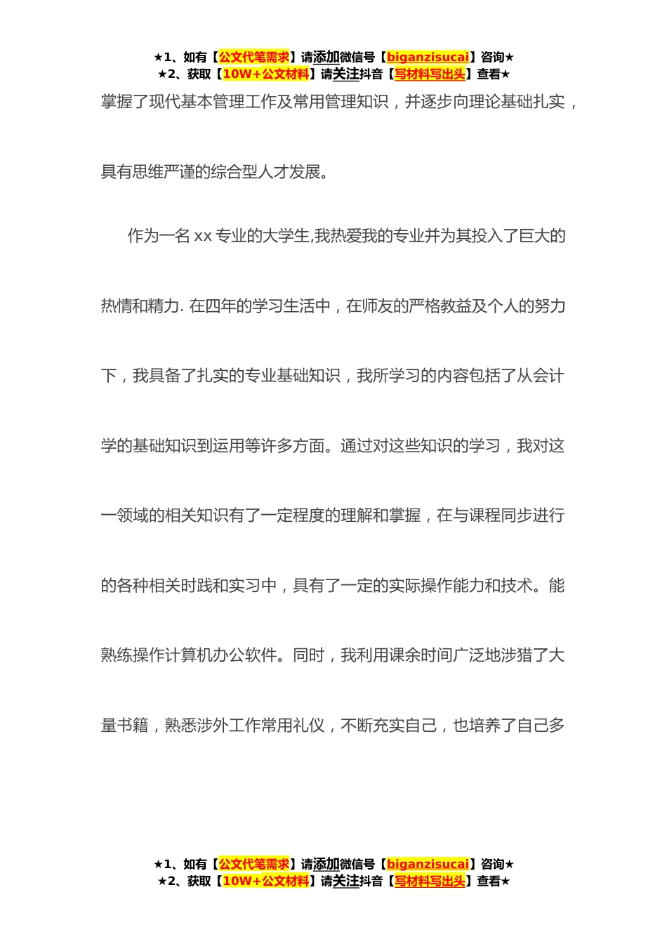 ★1、如有【公文代笔需求】请添加微信号【biganzisucai】咨询★★2、获取【10W+公文材料】请关注抖音【写材料写出头】查看★个人求职信尊敬的领导:您好!怀着对贵公司无比的憧憬和敬仰,谨将本材料呈递于上,真诚地感谢您从百忙之中抽出时间来看我的求职材料。我是xx大学的一名经济贸易系经济xx专业应届毕业生。在校的四年内,我一直信守做事尽心尽力的原则,努力学习文化知识,刻苦钻研专业技能,积极投入实践,全面充实和发展自己并取得一定的成绩。通过四年的学习,较系统地掌握了经济管理的基本理论和专业知识,在实习期间,坚持以理论联系实践,勤于动手动脑,★1、如有【公文代笔需求】请添加微信号【biganzisucai】咨询★★2、获取【10W+公文材料】请关注抖音【写材料写出头】查看★★1、如有【公文代笔需...