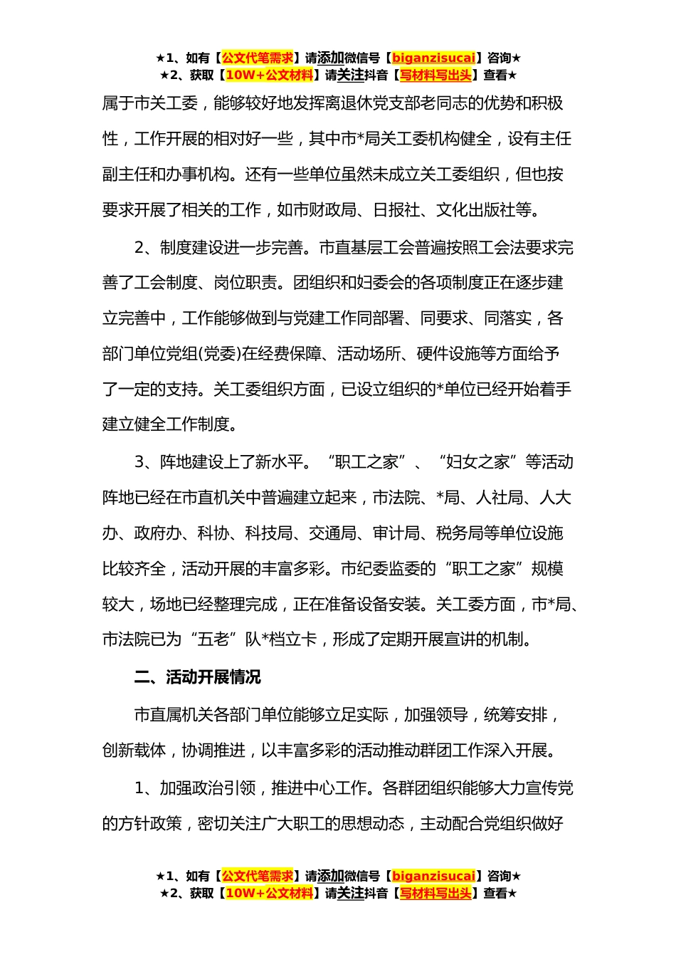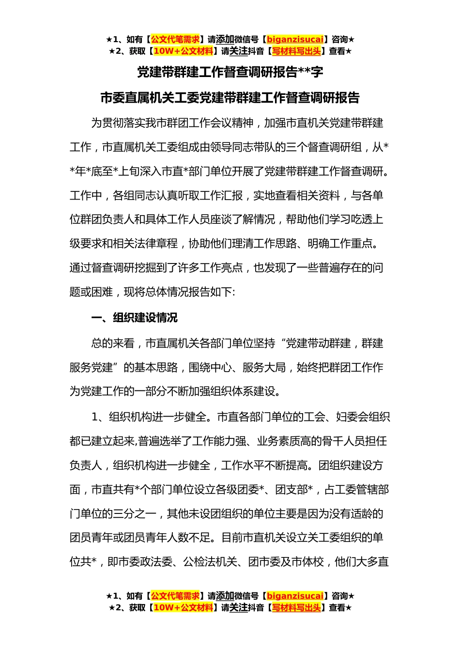★1、如有【公文代笔需求】请添加微信号【biganzisucai】咨询★★2、获取【10W+公文材料】请关注抖音【写材料写出头】查看★党建带群建工作督查调研报告**字市委直属机关工委党建带群建工作督查调研报告为贯彻落实我市群团工作会议精神,加强市直机关党建带群建工作,市直属机关工委组成由领导同志带队的三个督查调研组,从**年*底至*上旬深入市直*部门单位开展了党建带群建工作督查调研。工作中,各组同志认真听取工作汇报,实地查看相关资料,与各单位群团负责人和具体工作人员座谈了解情况,帮助他们学习吃透上级要求和相关法律章程,协助他们理清工作思路、明确工作重点。通过督查调研挖掘到了许多工作亮点,也发现了一些普遍存在的问题或困难,现将总体情况报告如下:一、组织建设情况总的来看,市直属机关各...