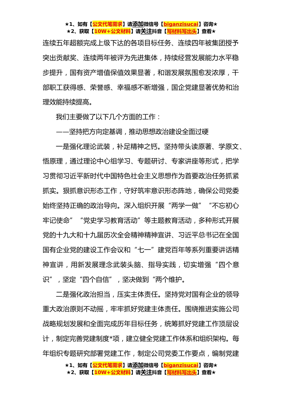 ★1、如有【公文代笔需求】请添加微信号【biganzisucai】咨询★★2、获取【10W+公文材料】请关注抖音【写材料写出头】查看★国有企业党委换届工作报告实干担当拼搏赶超奋力谱写高质量发展新篇章同志们:今天我们在这里召开全体党员大会,主要任务是听取和审查中共****第一届委员会报告,选举产生新一届公司党委,讨论并决定新一届公司党委的工作任务和目标,进一步团结带领全体党员干部职工,凝心聚力谋发展,笃行致远勇向前,加快推动公司“十四五”规划落实落地,为做实做强做大集团公司**子板块,谱写公司高质量发展新篇章而努力奋斗。下面,我以《实干担当拼搏赶超谱写高质量发展新篇章》为题,代表中共****第一届委员会作报告,请大会审议。一、五年来的工作成果过去的五年,是****发展史上极不平凡的五年。...