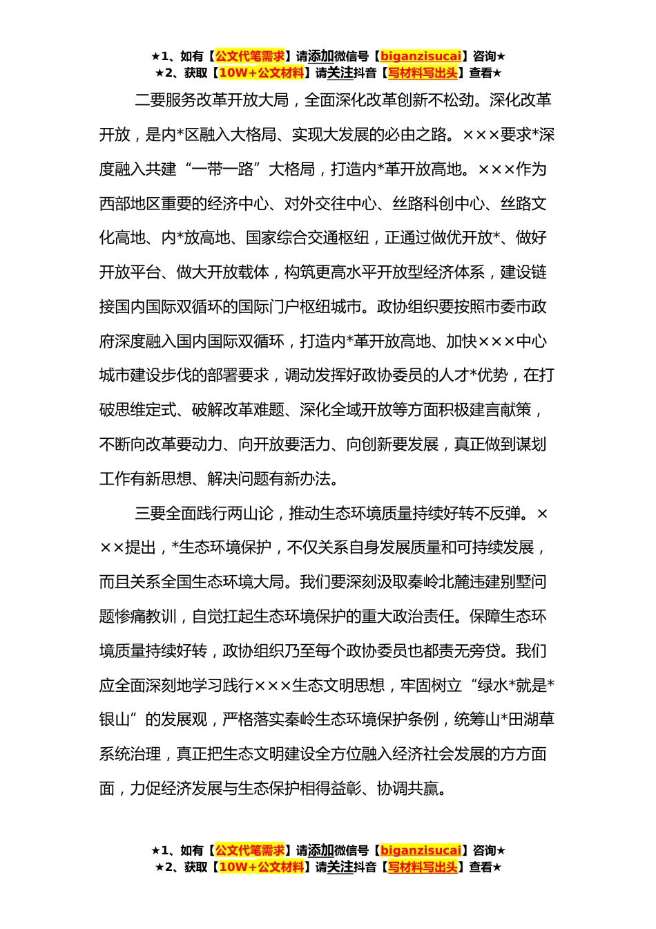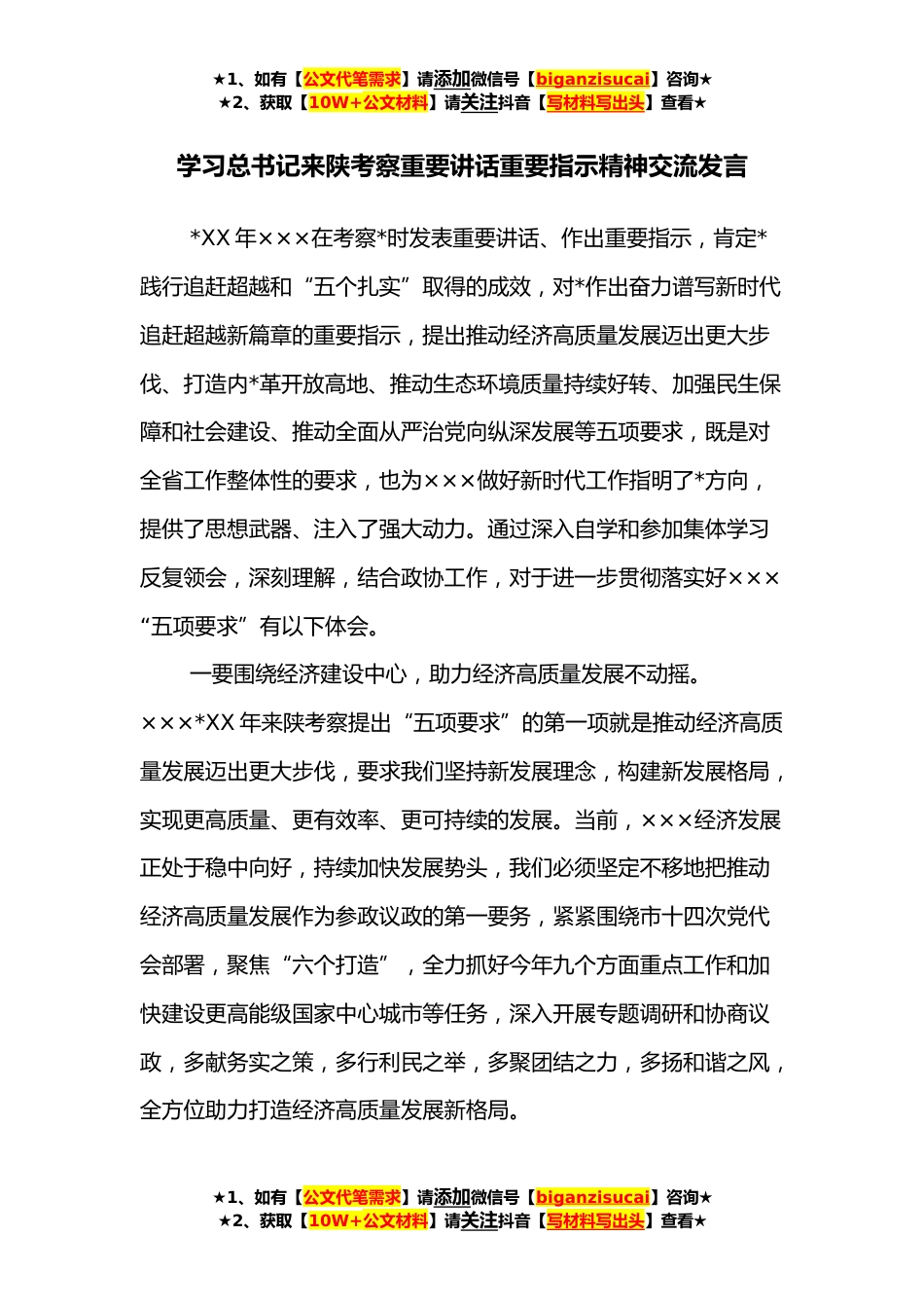 ★1、如有【公文代笔需求】请添加微信号【biganzisucai】咨询★★2、获取【10W+公文材料】请关注抖音【写材料写出头】查看★学习总书记来陕考察重要讲话重要指示精神交流发言*XX年×××在考察*时发表重要讲话、作出重要指示,肯定*践行追赶超越和“五个扎实”取得的成效,对*作出奋力谱写新时代追赶超越新篇章的重要指示,提出推动经济高质量发展迈出更大步伐、打造内*革开放高地、推动生态环境质量持续好转、加强民生保障和社会建设、推动全面从严治党向纵深发展等五项要求,既是对全省工作整体性的要求,也为×××做好新时代工作指明了*方向,提供了思想武器、注入了强大动力。通过深入自学和参加集体学习反复领会,深刻理解,结合政协工作,对于进一步贯彻落实好××ד五项要求”有以下体会。一要围绕经济...