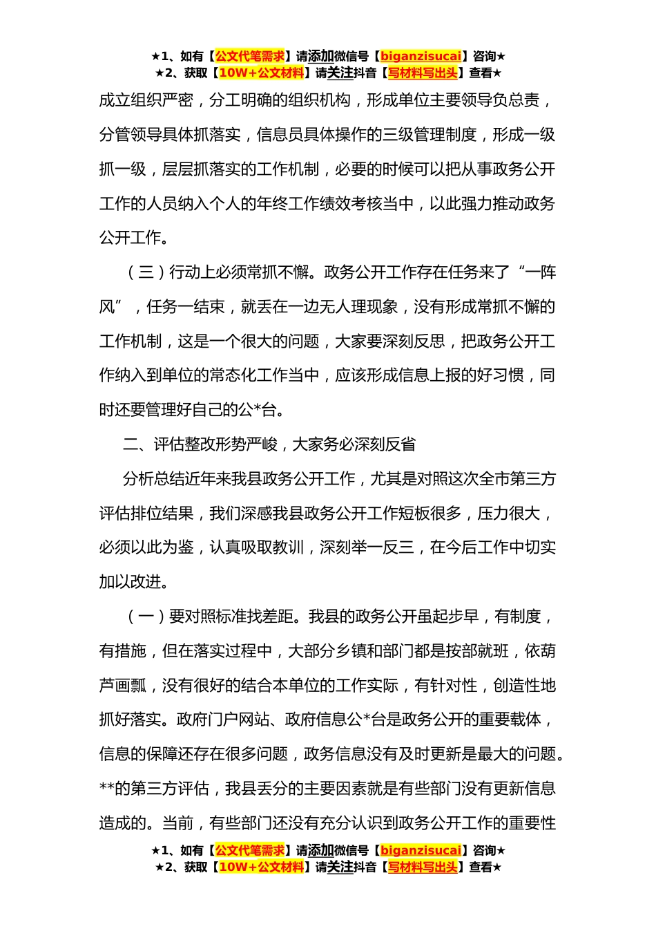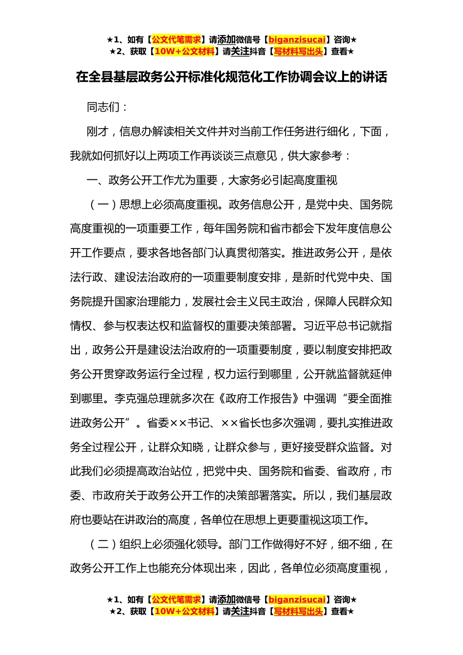 ★1、如有【公文代笔需求】请添加微信号【biganzisucai】咨询★★2、获取【10W+公文材料】请关注抖音【写材料写出头】查看★在全县基层政务公开标准化规范化工作协调会议上的讲话同志们:刚才,信息办解读相关文件并对当前工作任务进行细化,下面,我就如何抓好以上两项工作再谈谈三点意见,供大家参考:一、政务公开工作尤为重要,大家务必引起高度重视(一)思想上必须高度重视。政务信息公开,是党中央、国务院高度重视的一项重要工作,每年国务院和省市都会下发年度信息公开工作要点,要求各地各部门认真贯彻落实。推进政务公开,是依法行政、建设法治政府的一项重要制度安排,是新时代党中央、国务院提升国家治理能力,发展社会主义民主政治,保障人民群众知情权、参与权表达权和监督权的重要决策部署。习近...