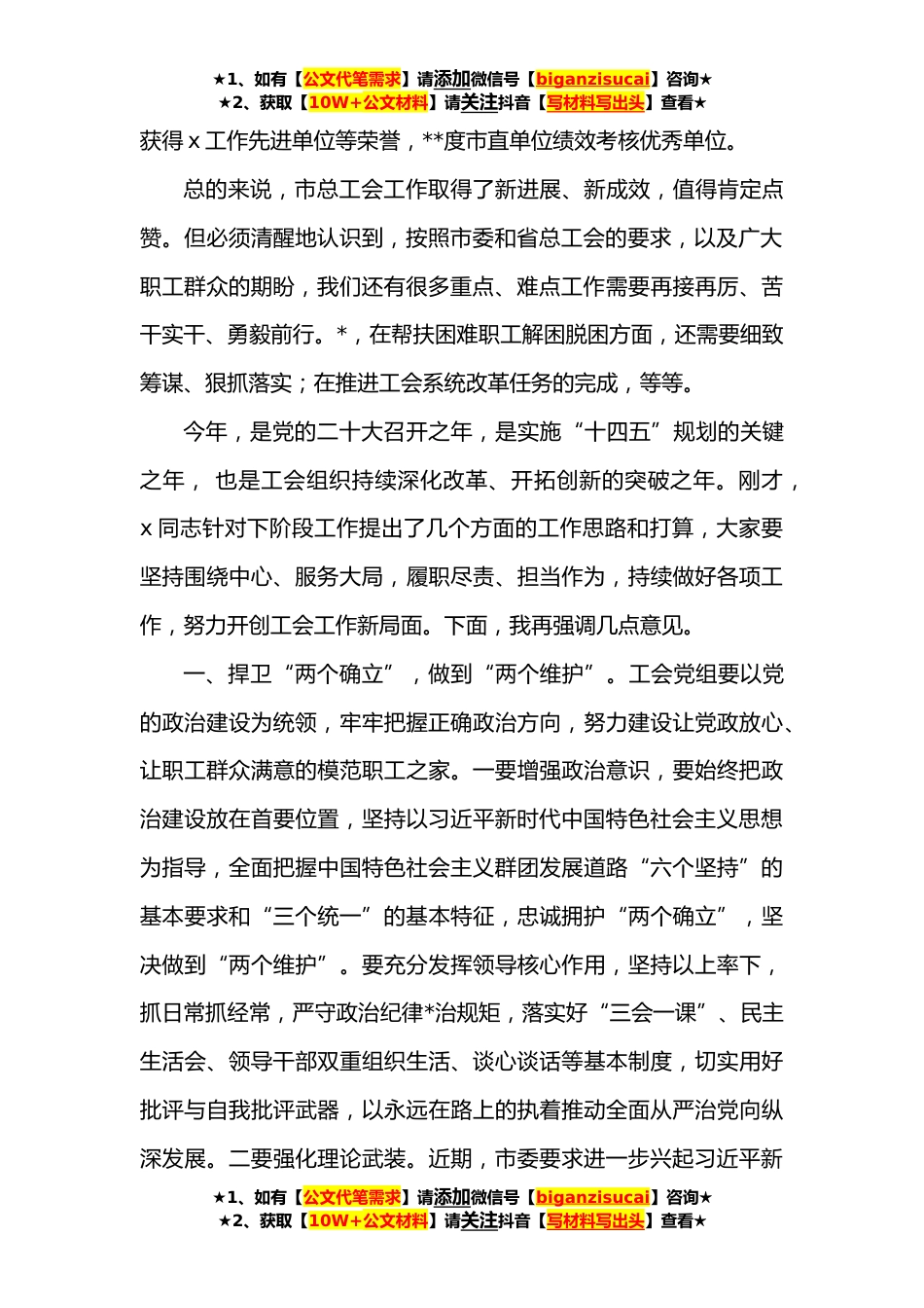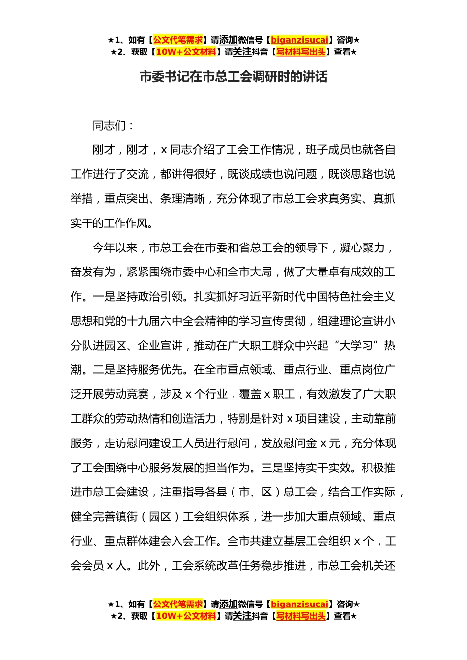 ★1、如有【公文代笔需求】请添加微信号【biganzisucai】咨询★★2、获取【10W+公文材料】请关注抖音【写材料写出头】查看★市委书记在市总工会调研时的讲话同志们:刚才,刚才,x同志介绍了工会工作情况,班子成员也就各自工作进行了交流,都讲得很好,既谈成绩也说问题,既谈思路也说举措,重点突出、条理清晰,充分体现了市总工会求真务实、真抓实干的工作作风。今年以来,市总工会在市委和省总工会的领导下,凝心聚力,奋发有为,紧紧围绕市委中心和全市大局,做了大量卓有成效的工作。一是坚持政治引领。扎实抓好习近平新时代中国特色社会主义思想和党的十九届六中全会精神的学习宣传贯彻,组建理论宣讲小分队进园区、企业宣讲,推动在广大职工群众中兴起“大学习”热潮。二是坚持服务优先。在全市重点领域、...