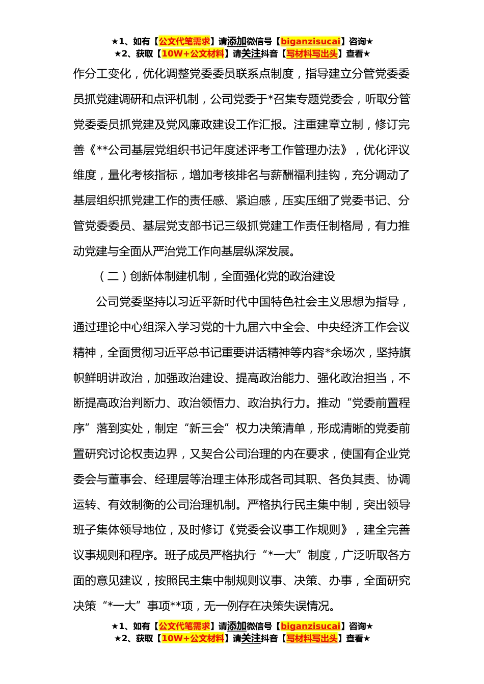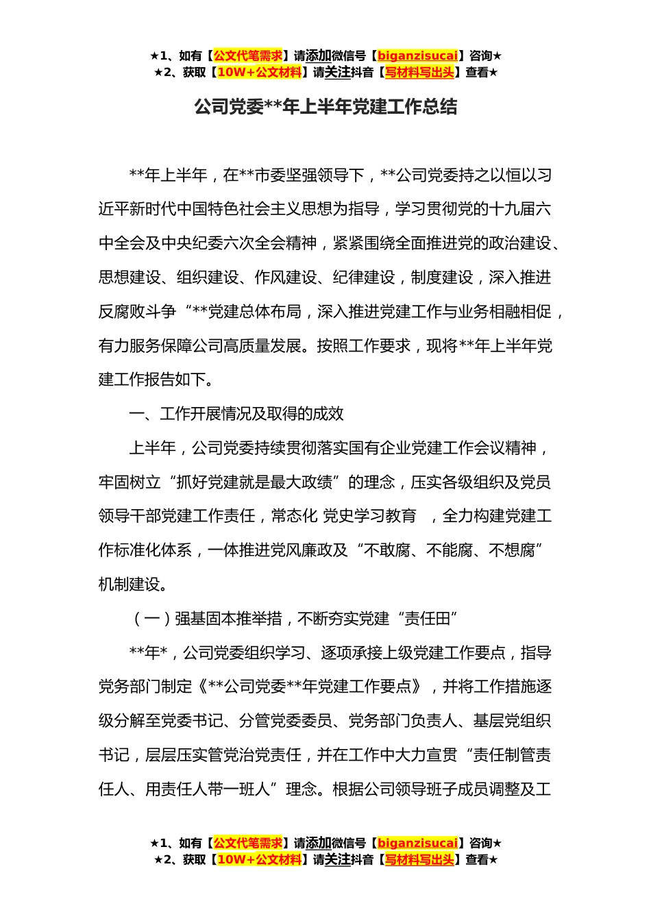 ★1、如有【公文代笔需求】请添加微信号【biganzisucai】咨询★★2、获取【10W+公文材料】请关注抖音【写材料写出头】查看★公司党委**年上半年党建工作总结**年上半年,在**市委坚强领导下,**公司党委持之以恒以习近平新时代中国特色社会主义思想为指导,学习贯彻党的十九届六中全会及中央纪委六次全会精神,紧紧围绕全面推进党的政治建设、思想建设、组织建设、作风建设、纪律建设,制度建设,深入推进反腐败斗争“**党建总体布局,深入推进党建工作与业务相融相促,有力服务保障公司高质量发展。按照工作要求,现将**年上半年党建工作报告如下。一、工作开展情况及取得的成效上半年,公司党委持续贯彻落实国有企业党建工作会议精神,牢固树立“抓好党建就是最大政绩”的理念,压实各级组织及党员领导干部党建...