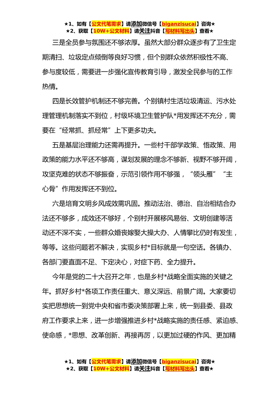 ★1、如有【公文代笔需求】请添加微信号【biganzisucai】咨询★★2、获取【10W+公文材料】请关注抖音【写材料写出头】查看★县委书记在**年全县乡村*工作会议上的讲话这次会议的主要目的是,通过现场参观学习,深刻总结我县实施乡村*战略存在的问题和不足,瞄准目标任务,大力推进乡村*工作,着力掀起示范引领、勇创一流的建设热潮,营造你追我赶、比学赶超的浓厚氛围,大力推动致富产业更加兴旺,人居环境更有颜值,乡风民风更加文明,基层治理更加有效,群众生活更加幸福,广大党员干部工作能力明显提升,想干事、会干事、干成事的本领明显增强,为加快乡村*战略实施奠定了坚实基础。下面,我再讲*意见。一、要深化认识,强化担当,聚力攻坚突破不懈怠脱贫摘帽不是终点,而是新生活的起点。巩固脱贫成果,推进乡...