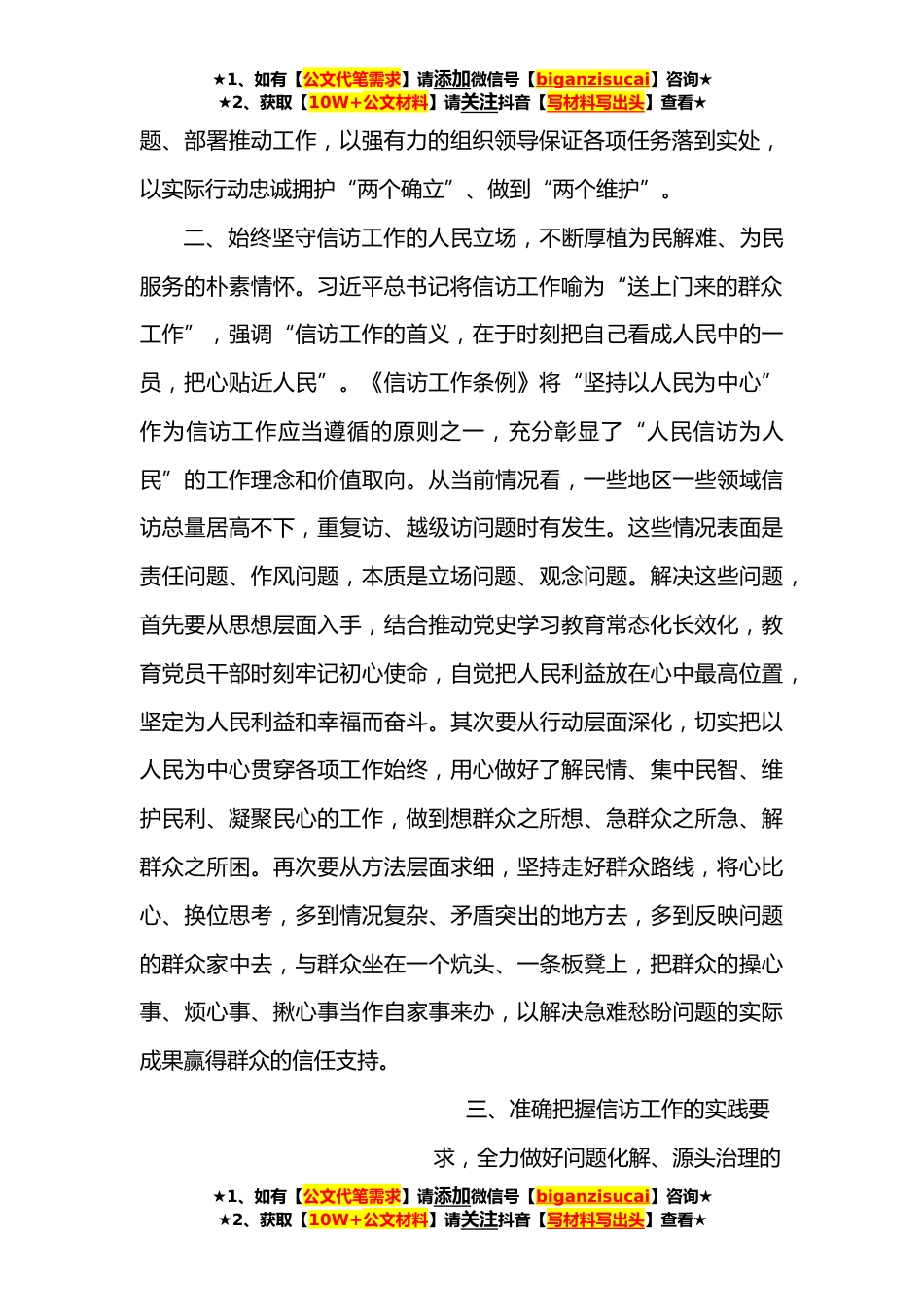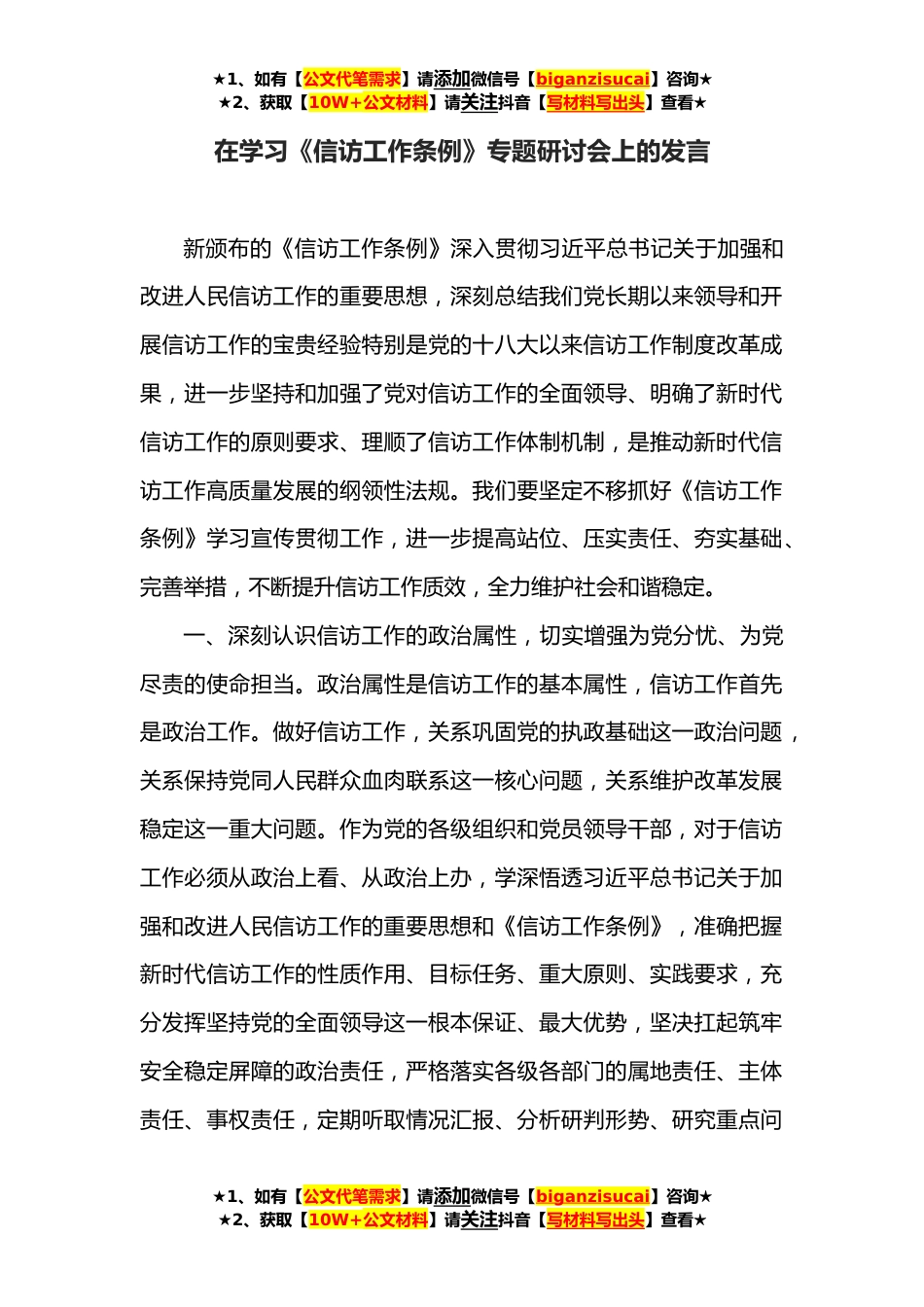 ★1、如有【公文代笔需求】请添加微信号【biganzisucai】咨询★★2、获取【10W+公文材料】请关注抖音【写材料写出头】查看★在学习《信访工作条例》专题研讨会上的发言新颁布的《信访工作条例》深入贯彻习近平总书记关于加强和改进人民信访工作的重要思想,深刻总结我们党长期以来领导和开展信访工作的宝贵经验特别是党的十八大以来信访工作制度改革成果,进一步坚持和加强了党对信访工作的全面领导、明确了新时代信访工作的原则要求、理顺了信访工作体制机制,是推动新时代信访工作高质量发展的纲领性法规。我们要坚定不移抓好《信访工作条例》学习宣传贯彻工作,进一步提高站位、压实责任、夯实基础、完善举措,不断提升信访工作质效,全力维护社会和谐稳定。一、深刻认识信访工作的政治属性,切实增强为党分忧...