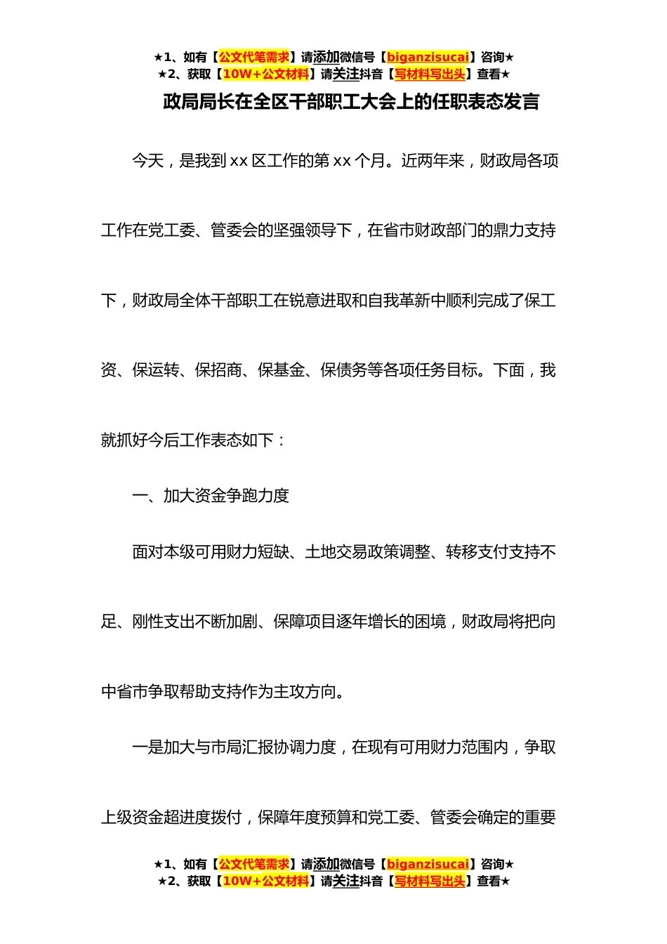 ★1、如有【公文代笔需求】请添加微信号【biganzisucai】咨询★★2、获取【10W+公文材料】请关注抖音【写材料写出头】查看★政局局长在全区干部职工大会上的任职表态发言今天,是我到xx区工作的第xx个月。近两年来,财政局各项工作在党工委、管委会的坚强领导下,在省市财政部门的鼎力支持下,财政局全体干部职工在锐意进取和自我革新中顺利完成了保工资、保运转、保招商、保基金、保债务等各项任务目标。下面,我就抓好今后工作表态如下:一、加大资金争跑力度面对本级可用财力短缺、土地交易政策调整、转移支付支持不足、刚性支出不断加剧、保障项目逐年增长的困境,财政局将把向中省市争取帮助支持作为主攻方向。一是加大与市局汇报协调力度,在现有可用财力范围内,争取上级资金超进度拨付,保障年度预算和党...