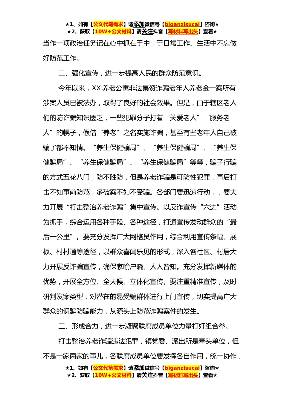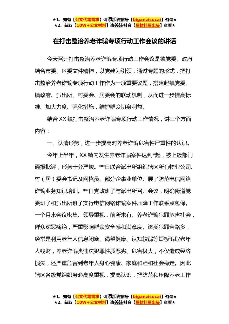 ★1、如有【公文代笔需求】请添加微信号【biganzisucai】咨询★★2、获取【10W+公文材料】请关注抖音【写材料写出头】查看★在打击整治养老诈骗专项行动工作会议的讲话今天召开打击整治养老诈骗专项行动工作会议是镇党委、政府结合市委、区委文件精神,以党建为引领,通过专题的形式,把打击整治养老诈骗专项行动工作作为一项重要议题,搭建起镇党委、镇政府、派出所、村委会、居委会的联动机制,从而进一步提高标准、加大力度、强化措施,维护群众切身利益。结合XX镇打击整治养老诈骗专项行动工作情况,讲三个方面内容:一、认清形势,进一步提高对养老诈骗危害性严重性的认识。今年上半年,XX镇内发生养老诈骗案件达到*起,被上级部门通报批评,形势十分严峻。**日联合派出所组织辖区所有物业公司、村(居)委会...