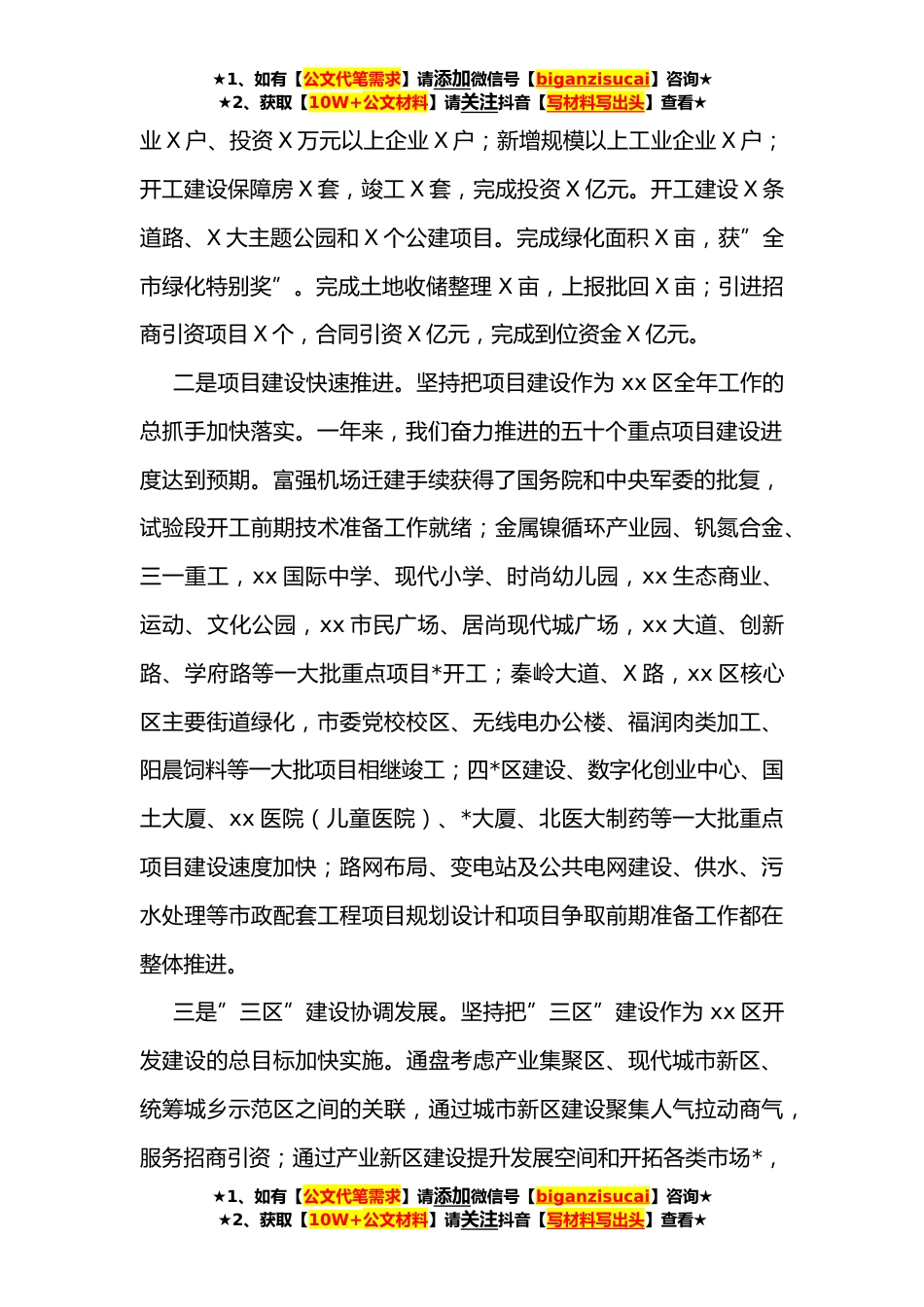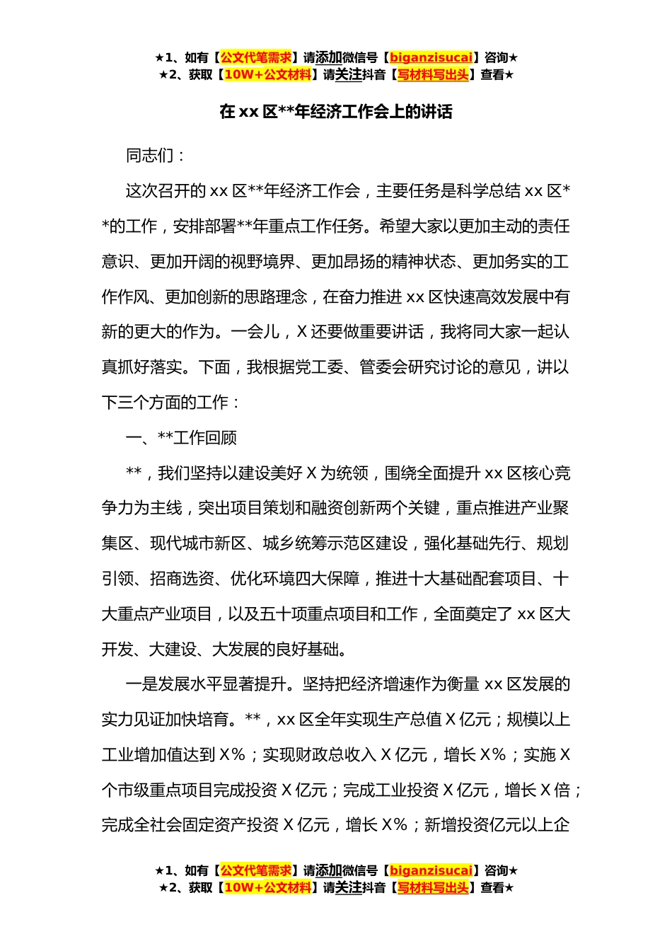 ★1、如有【公文代笔需求】请添加微信号【biganzisucai】咨询★★2、获取【10W+公文材料】请关注抖音【写材料写出头】查看★在xx区**年经济工作会上的讲话同志们:这次召开的xx区**年经济工作会,主要任务是科学总结xx区**的工作,安排部署**年重点工作任务。希望大家以更加主动的责任意识、更加开阔的视野境界、更加昂扬的精神状态、更加务实的工作作风、更加创新的思路理念,在奋力推进xx区快速高效发展中有新的更大的作为。一会儿,X还要做重要讲话,我将同大家一起认真抓好落实。下面,我根据党工委、管委会研究讨论的意见,讲以下三个方面的工作:一、**工作回顾**,我们坚持以建设美好X为统领,围绕全面提升xx区核心竞争力为主线,突出项目策划和融资创新两个关键,重点推进产业聚集区、现代城市新区、城乡...
