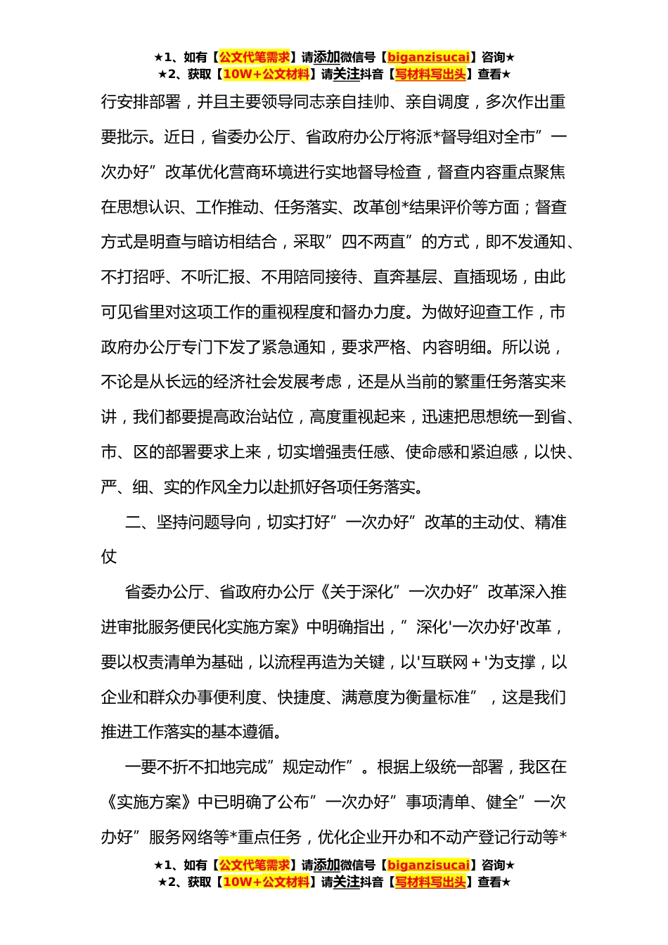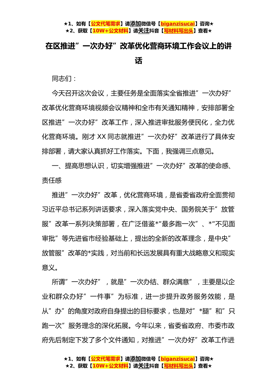 ★1、如有【公文代笔需求】请添加微信号【biganzisucai】咨询★★2、获取【10W+公文材料】请关注抖音【写材料写出头】查看★在区推进”一次办好”改革优化营商环境工作会议上的讲话同志们:今天召开这次会议,主要任务是全面落实全省推进”一次办好”改革优化营商环境视频会议精神和全市有关通知精神,安排部署全区推进”一次办好”改革工作,深入推进审批服务便民化,全力优化营商环境。刚才XX同志就推进”一次办好”改革进行了具体安排部署,请大家认真抓好工作落实。下面,我强调三点意见。一、提高思想认识,切实增强推进”一次办好”改革的使命感、责任感推进”一次办好”改革,优化营商环境,是省委省政府全面贯彻习近平总书记系列讲话要求,深入落实党中央、国务院关于”放管服”改革一系列决策部署,在广...