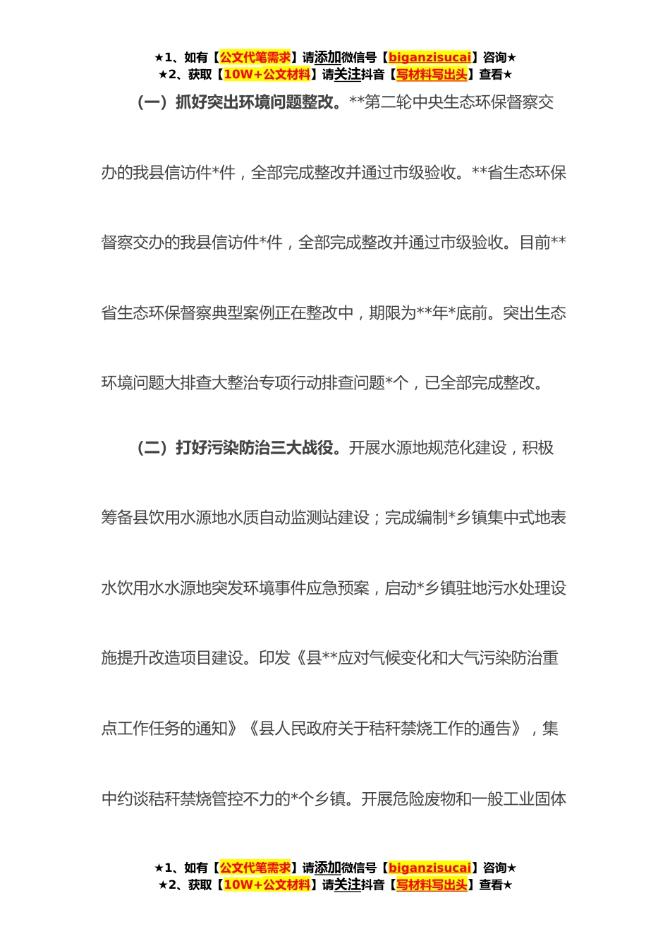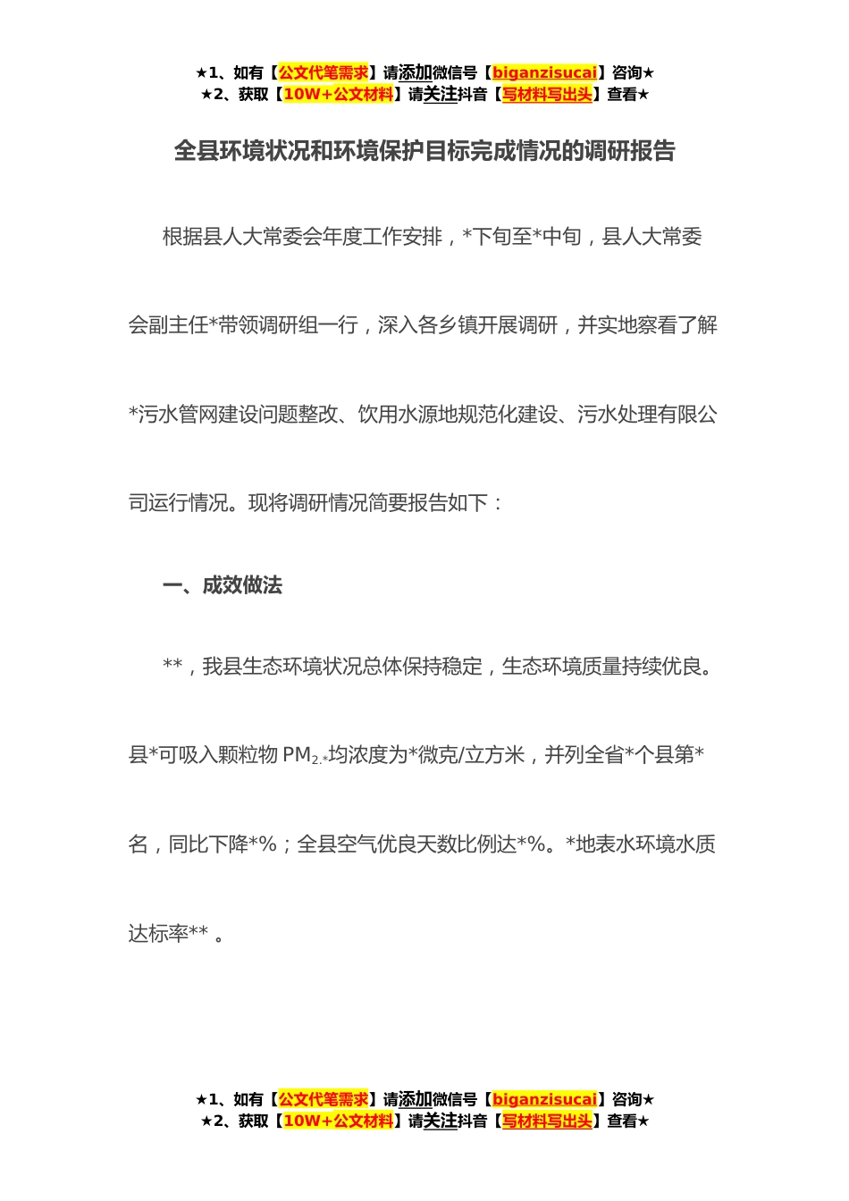 ★1、如有【公文代笔需求】请添加微信号【biganzisucai】咨询★★2、获取【10W+公文材料】请关注抖音【写材料写出头】查看★全县环境状况和环境保护目标完成情况的调研报告根据县人大常委会年度工作安排,*下旬至*中旬,县人大常委会副主任*带领调研组一行,深入各乡镇开展调研,并实地察看了解*污水管网建设问题整改、饮用水源地规范化建设、污水处理有限公司运行情况。现将调研情况简要报告如下:一、成效做法**,我县生态环境状况总体保持稳定,生态环境质量持续优良。县*可吸入颗粒物PM2.*均浓度为*微克/立方米,并列全省*个县第*名,同比下降*%;全县空气优良天数比例达*%。*地表水环境水质达标率**。★1、如有【公文代笔需求】请添加微信号【biganzisucai】咨询★★2、获取【10W+公文材料】请关注抖音【写材...