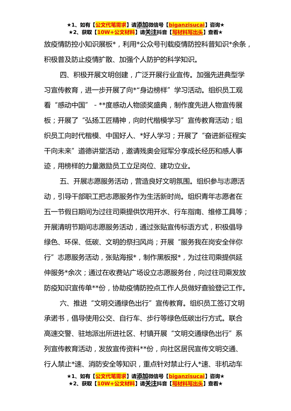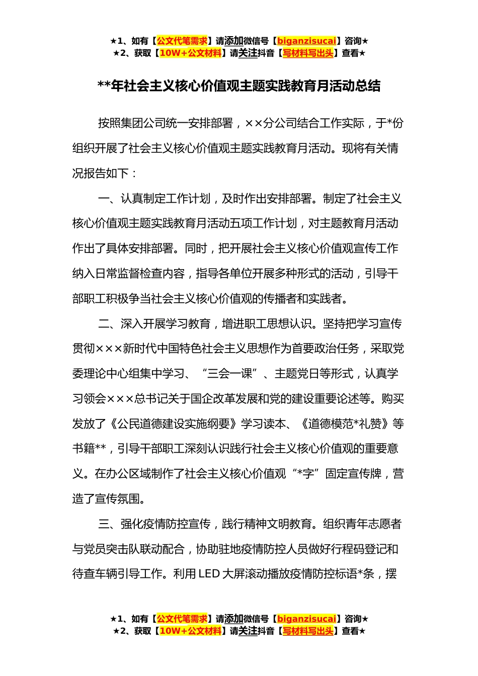 ★1、如有【公文代笔需求】请添加微信号【biganzisucai】咨询★★2、获取【10W+公文材料】请关注抖音【写材料写出头】查看★**年社会主义核心价值观主题实践教育月活动总结按照集团公司统一安排部署,××分公司结合工作实际,于*份组织开展了社会主义核心价值观主题实践教育月活动。现将有关情况报告如下:一、认真制定工作计划,及时作出安排部署。制定了社会主义核心价值观主题实践教育月活动五项工作计划,对主题教育月活动作出了具体安排部署。同时,把开展社会主义核心价值观宣传工作纳入日常监督检查内容,指导各单位开展多种形式的活动,引导干部职工积极争当社会主义核心价值观的传播者和实践者。二、深入开展学习教育,增进职工思想认识。坚持把学习宣传贯彻×××新时代中国特色社会主义思想作为首要政...