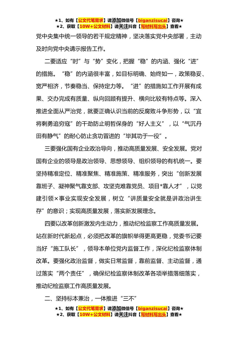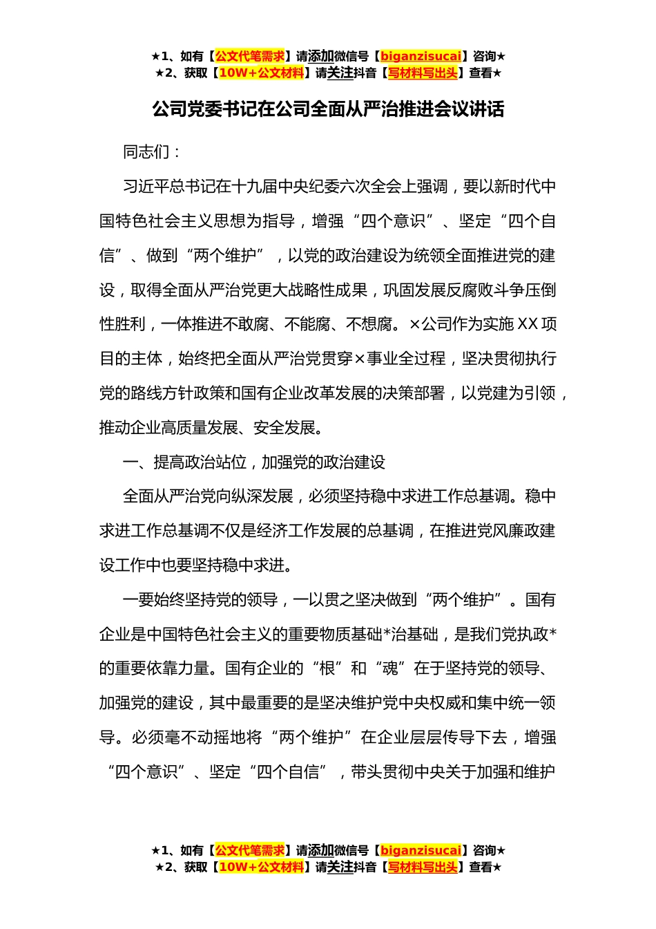 ★1、如有【公文代笔需求】请添加微信号【biganzisucai】咨询★★2、获取【10W+公文材料】请关注抖音【写材料写出头】查看★公司党委书记在公司全面从严治推进会议讲话同志们:习近平总书记在十九届中央纪委六次全会上强调,要以新时代中国特色社会主义思想为指导,增强“四个意识”、坚定“四个自信”、做到“两个维护”,以党的政治建设为统领全面推进党的建设,取得全面从严治党更大战略性成果,巩固发展反腐败斗争压倒性胜利,一体推进不敢腐、不能腐、不想腐。×公司作为实施XX项目的主体,始终把全面从严治党贯穿×事业全过程,坚决贯彻执行党的路线方针政策和国有企业改革发展的决策部署,以党建为引领,推动企业高质量发展、安全发展。一、提高政治站位,加强党的政治建设全面从严治党向纵深发展,必须坚...