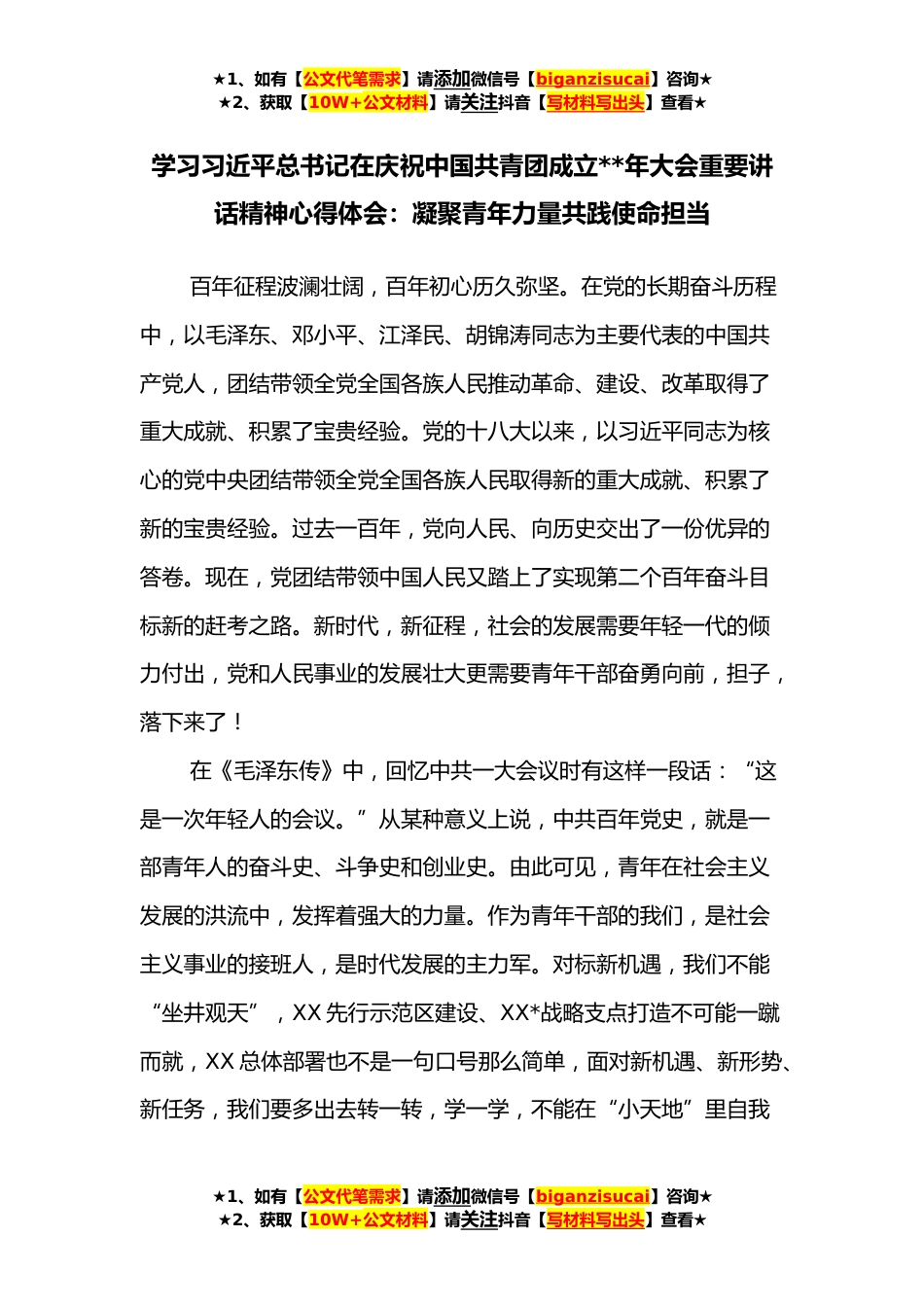★1、如有【公文代笔需求】请添加微信号【biganzisucai】咨询★★2、获取【10W+公文材料】请关注抖音【写材料写出头】查看★学习习近平总书记在庆祝中国共青团成立**年大会重要讲话精神心得体会:凝聚青年力量共践使命担当百年征程波澜壮阔,百年初心历久弥坚。在党的长期奋斗历程中,以毛泽东、邓小平、江泽民、胡锦涛同志为主要代表的中国共产党人,团结带领全党全国各族人民推动革命、建设、改革取得了重大成就、积累了宝贵经验。党的十八大以来,以习近平同志为核心的党中央团结带领全党全国各族人民取得新的重大成就、积累了新的宝贵经验。过去一百年,党向人民、向历史交出了一份优异的答卷。现在,党团结带领中国人民又踏上了实现第二个百年奋斗目标新的赶考之路。新时代,新征程,社会的发展需要年轻一代...