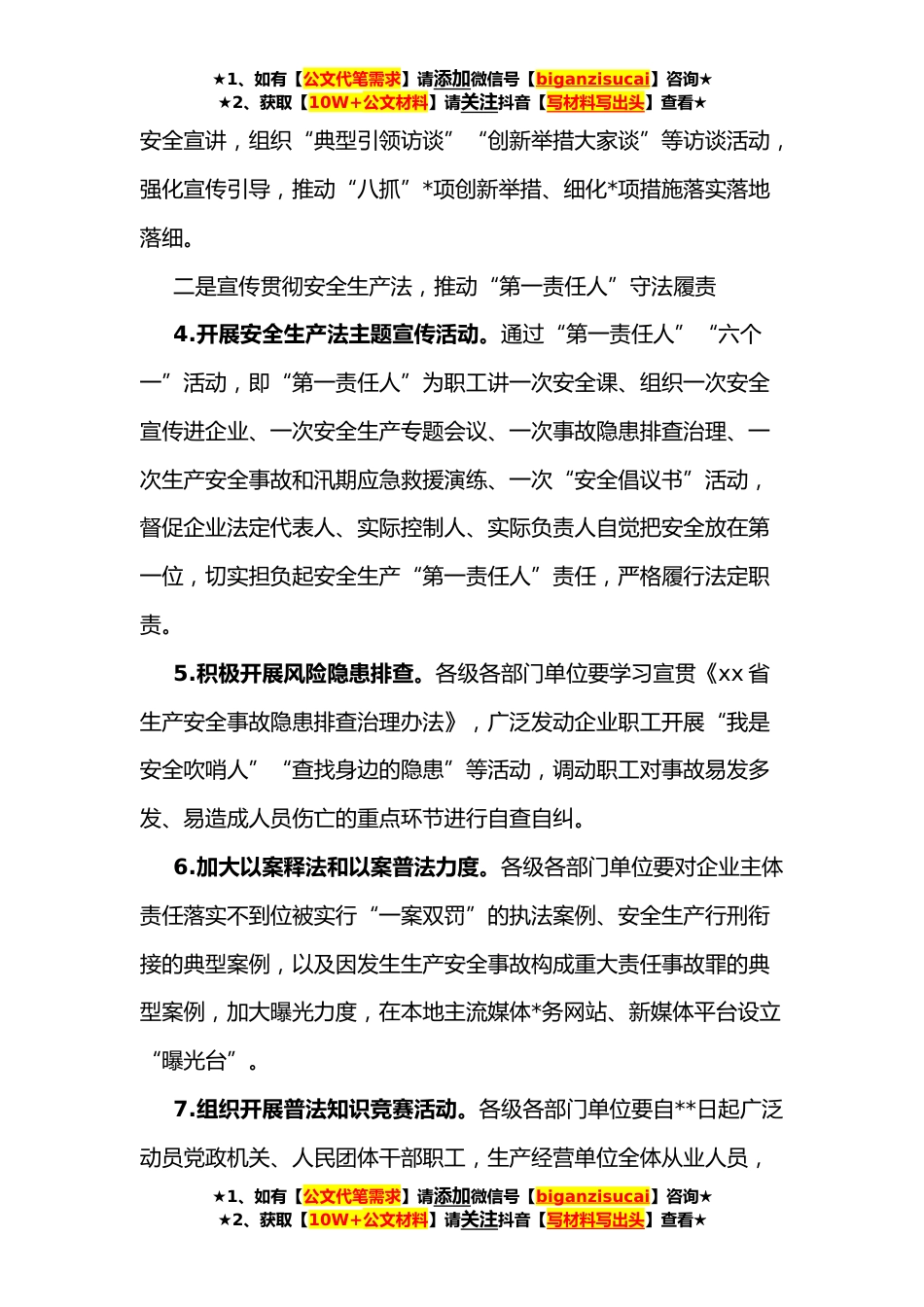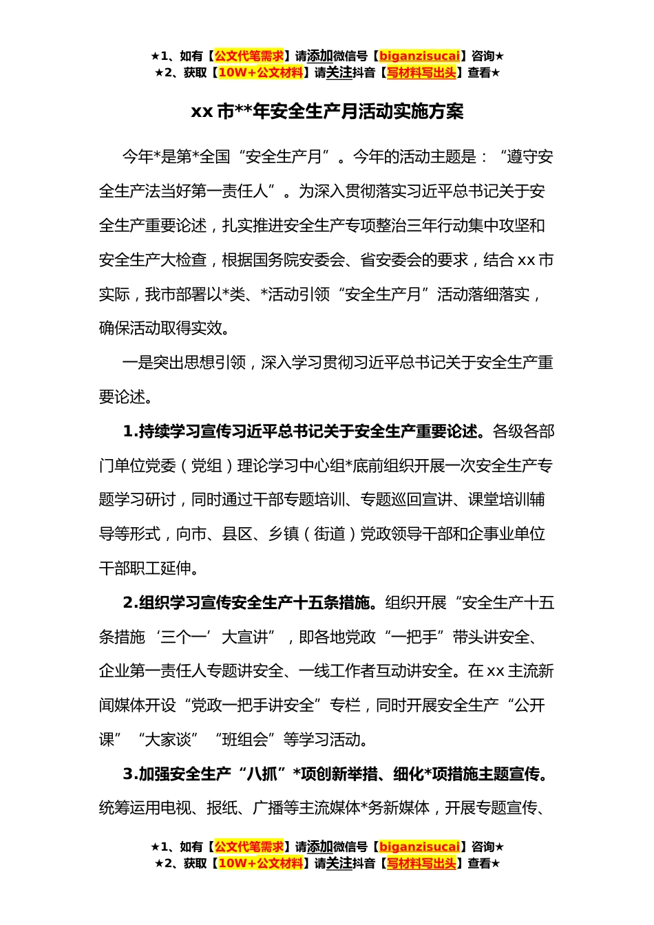 ★1、如有【公文代笔需求】请添加微信号【biganzisucai】咨询★★2、获取【10W+公文材料】请关注抖音【写材料写出头】查看★xx市**年安全生产月活动实施方案今年*是第*全国“安全生产月”。今年的活动主题是:“遵守安全生产法当好第一责任人”。为深入贯彻落实习近平总书记关于安全生产重要论述,扎实推进安全生产专项整治三年行动集中攻坚和安全生产大检查,根据国务院安委会、省安委会的要求,结合xx市实际,我市部署以*类、*活动引领“安全生产月”活动落细落实,确保活动取得实效。一是突出思想引领,深入学习贯彻习近平总书记关于安全生产重要论述。1.持续学习宣传习近平总书记关于安全生产重要论述。各级各部门单位党委(党组)理论学习中心组*底前组织开展一次安全生产专题学习研讨,同时通过干部专题培训...