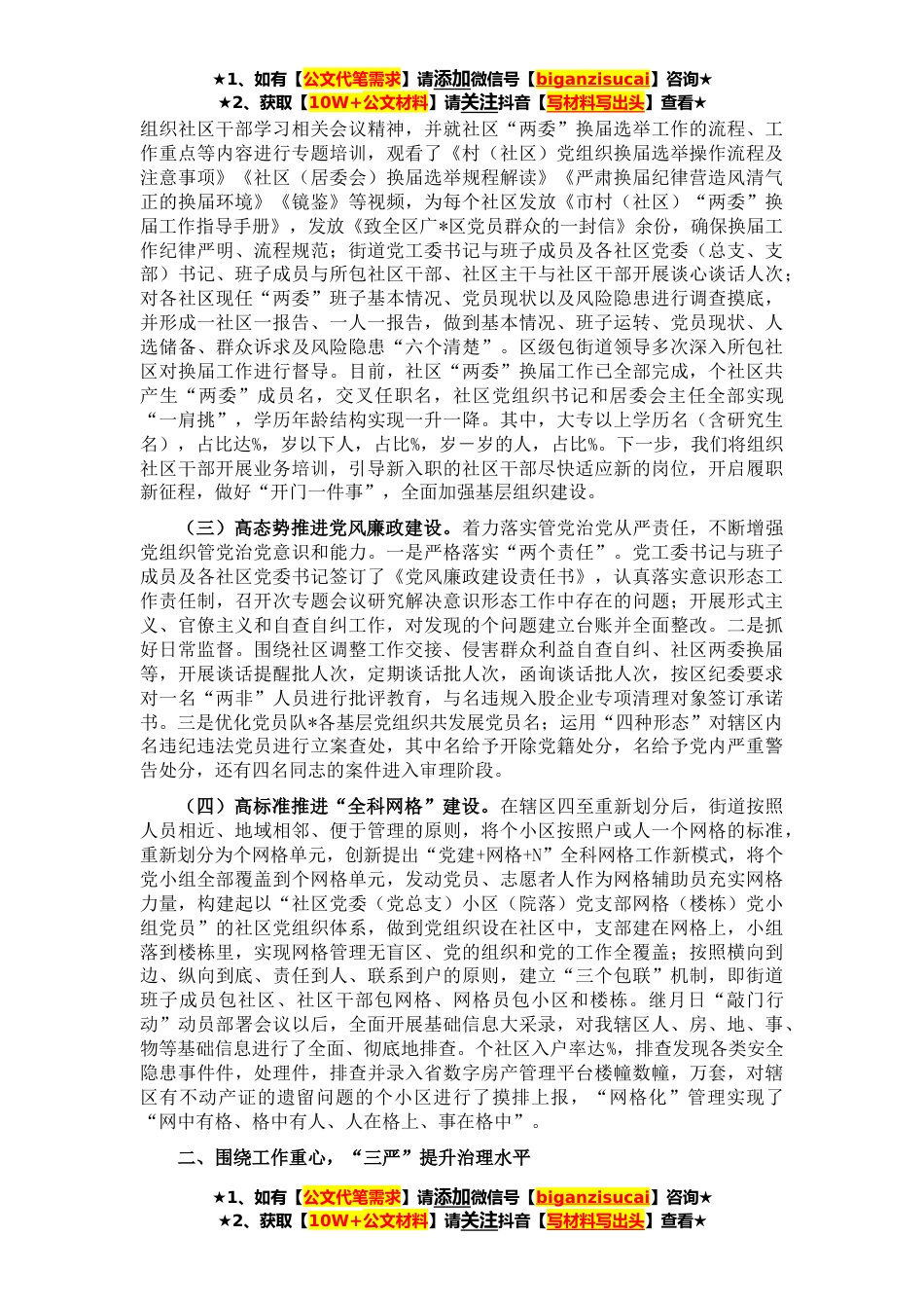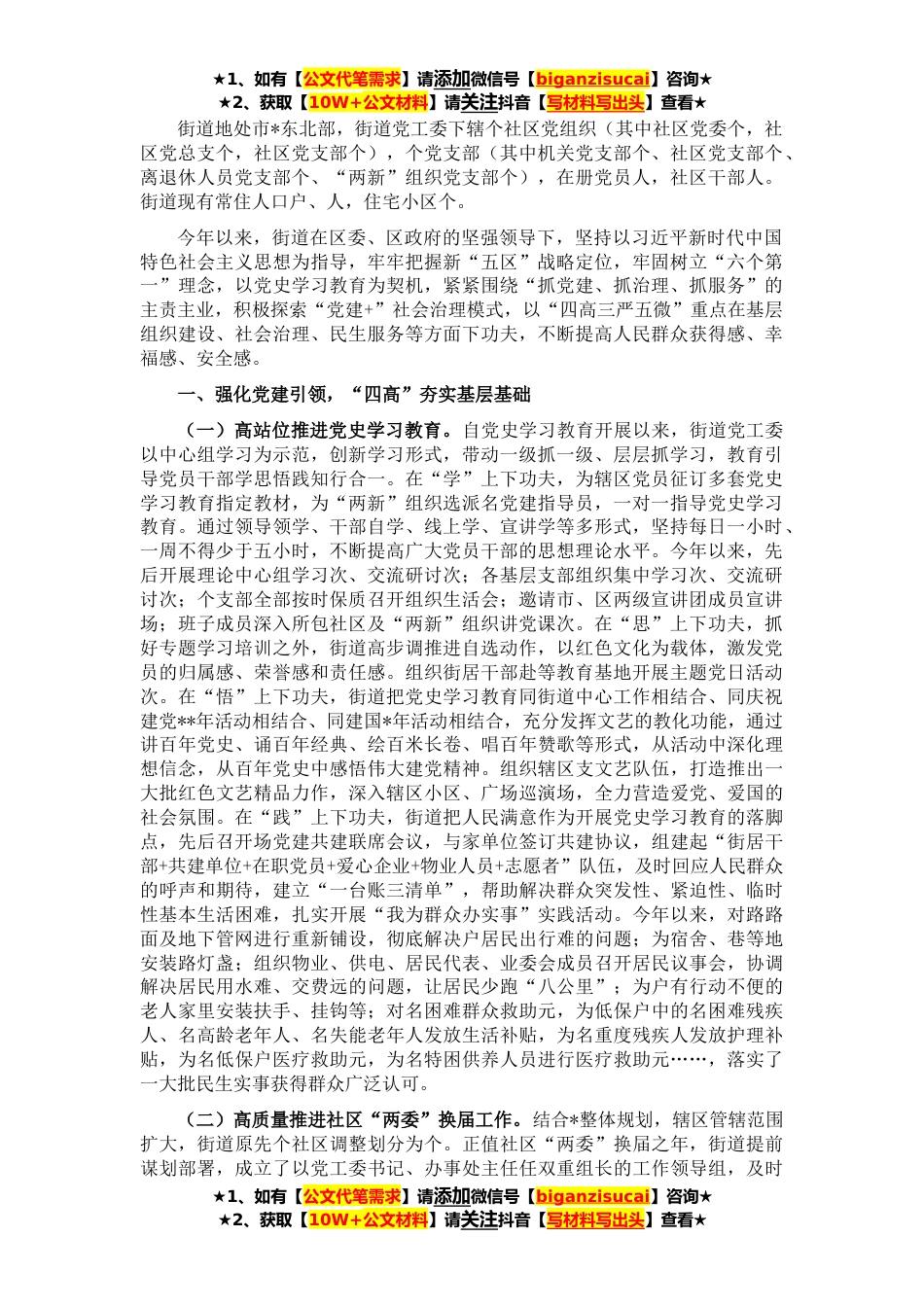 ★1、如有【公文代笔需求】请添加微信号【biganzisucai】咨询★★2、获取【10W+公文材料】请关注抖音【写材料写出头】查看★街道地处市*东北部,街道党工委下辖个社区党组织(其中社区党委个,社区党总支个,社区党支部个),个党支部(其中机关党支部个、社区党支部个、离退休人员党支部个、“两新”组织党支部个),在册党员人,社区干部人。街道现有常住人口户、人,住宅小区个。今年以来,街道在区委、区政府的坚强领导下,坚持以习近平新时代中国特色社会主义思想为指导,牢牢把握新“五区”战略定位,牢固树立“六个第一”理念,以党史学习教育为契机,紧紧围绕“抓党建、抓治理、抓服务”的主责主业,积极探索“党建+”社会治理模式,以“四高三严五微”重点在基层组织建设、社会治理、民生服务等方面下功...