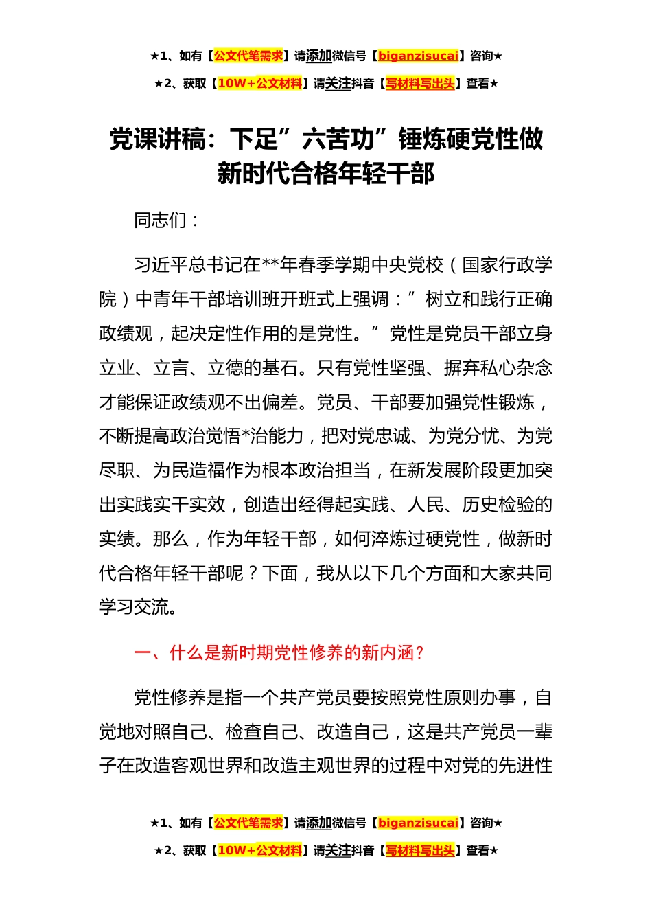 ★1、如有【公文代笔需求】请添加微信号【biganzisucai】咨询★★2、获取【10W+公文材料】请关注抖音【写材料写出头】查看★党课讲稿:下足”六苦功”锤炼硬党性做新时代合格年轻干部同志们:习近平总书记在**年春季学期中央党校(国家行政学院)中青年干部培训班开班式上强调:”树立和践行正确政绩观,起决定性作用的是党性。”党性是党员干部立身立业、立言、立德的基石。只有党性坚强、摒弃私心杂念才能保证政绩观不出偏差。党员、干部要加强党性锻炼,不断提高政治觉悟*治能力,把对党忠诚、为党分忧、为党尽职、为民造福作为根本政治担当,在新发展阶段更加突出实践实干实效,创造出经得起实践、人民、历史检验的实绩。那么,作为年轻干部,如何淬炼过硬党性,做新时代合格年轻干部呢?下面,我从以下几个方...